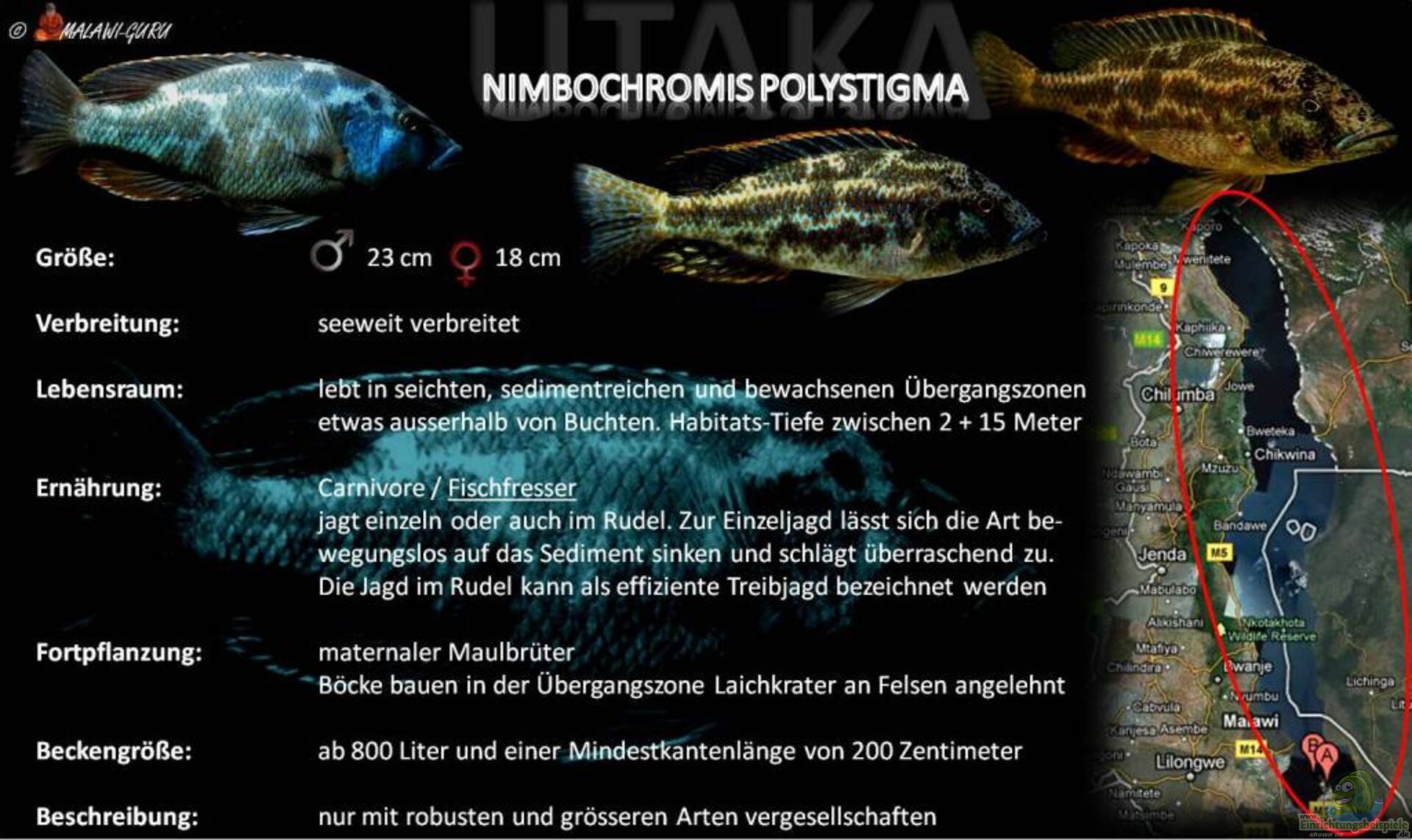 WICHTIG: eine Vergesellschaftung mit anderen Nimbochromis-Arten birgt das Risiko von Kreuzungen und somit der Hybridisierung!
