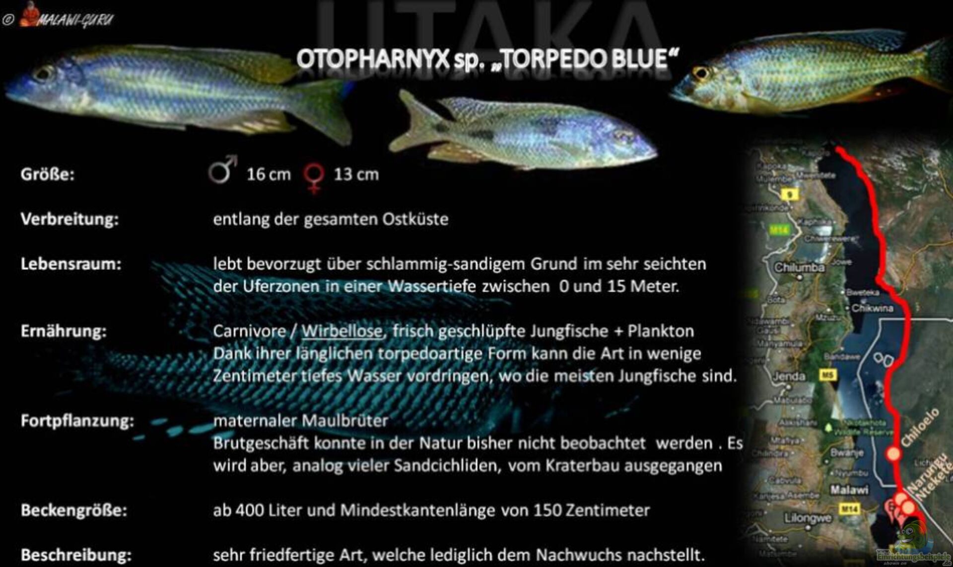 Otopharnyx sp. ???torpedo blue??? ist fast an der gesamten Ostküste des Malawi-Sees verbreitet, wobei die dichtesten Bestände eher im Süden zwischen Chiloelo und Ntekete zu finden sind.