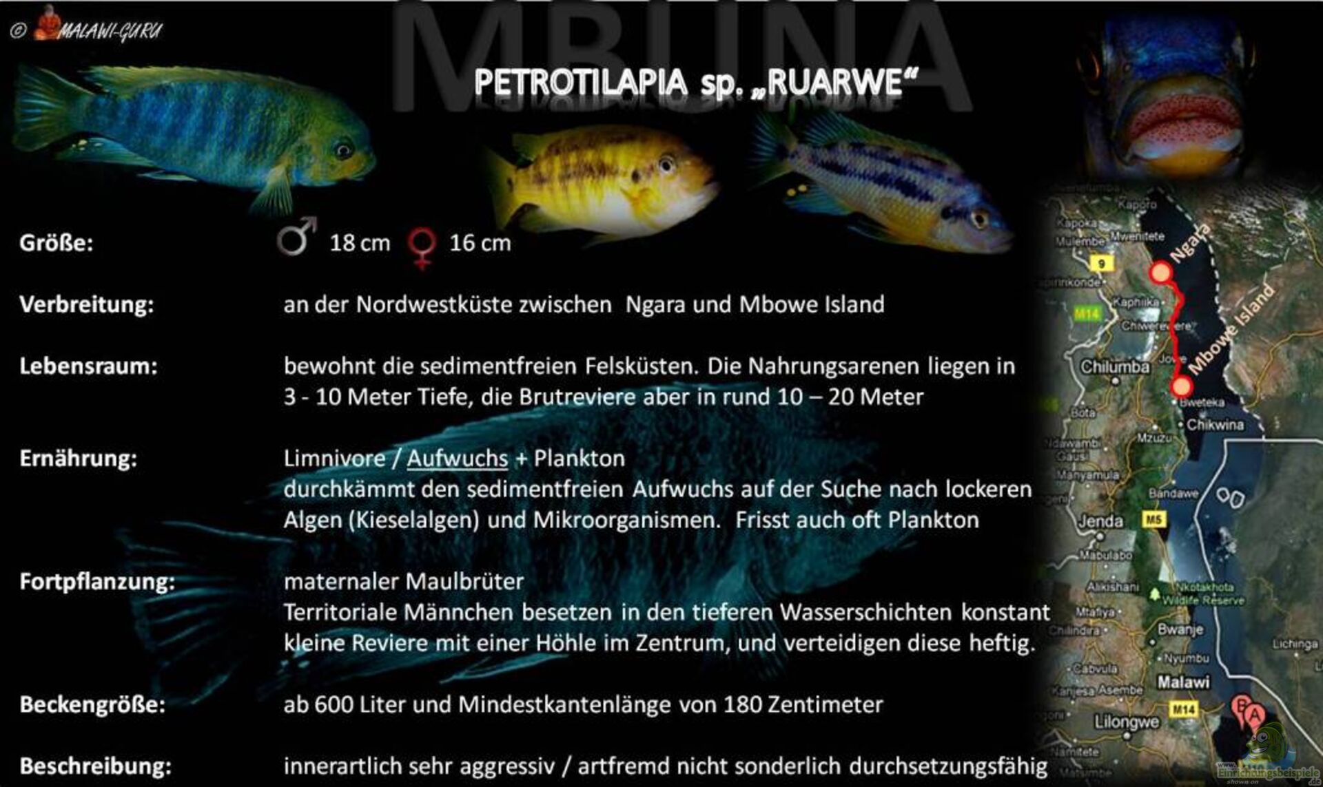 Solche seichten Regionen des reinen Felsbiotops sind durch die vielen anwesenden und recht aggressiven Mbuna-Arten sehr stark umkämpft. Artfremde Tiere wie P. sp. ???ruarwe??? werden in deren Revieren weitest gehend toleriert, sofern sie keine Revier-Ansprüche stellen. Die territorialen Männchen des Ruarwe aber sind gezwungen, ihre Brutreviere in den tiefer gelegenen Bereichen abzustecken, da sie sich gegen die noch aggressiveren Arten weiter oben nicht durchzusetzen vermögen.