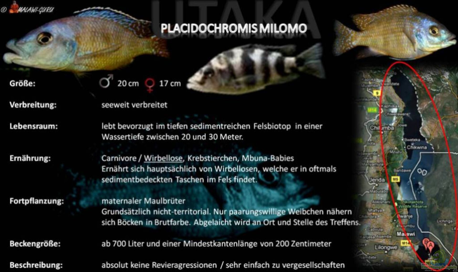 Die Milomo???s sollten nicht mit zu aggressiven Arten vergesellschaftet werden. Hier kämen insbesondere Utakas und andere Haplochromine, sowie einige ruhige Räuber in Betracht. Da sich P. milomo aber vorwiegend von Wirbellosen und Kleinstlebewesen ernährt, welche er in Felstaschen zwischen dem Aufwuchs findet, wäre auch eine Vergesellschaftung sogar mit ???friedlichen??? Mbunas möglich, wenn es sich um Arten handelt, welche vor allem Kleinstlebewesen aus dem Aufwuchs picken.
