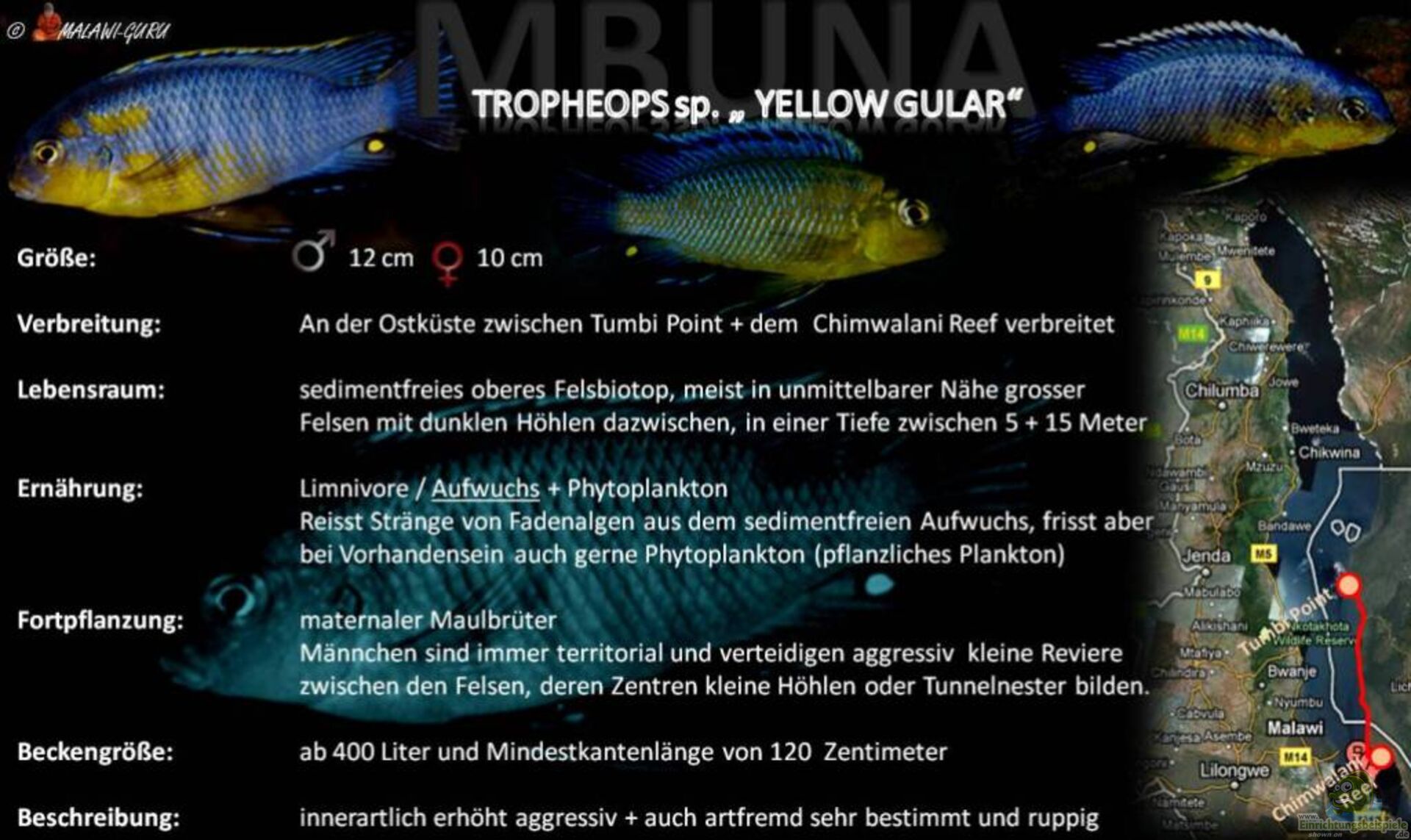 INFO: Zwischen N???kolongwe und Gome lebt T. sp. ???yellow gular??? sympatrisch mit Tropheops sp. ???gome-yellow???, wobei die Männchen der beiden Arten fast identisch zu sein scheinen. Lediglich anhand der Färbung der Weibchen können die beiden Arten vernünftig auseinander gehalten werden. Während die Weibchen der ???Yellow Gular???, wie für Angehörige der Black-Type-Tropheops typisch, sehr dunkel gefärbt sind und ein breites submarginales Band auf der Dorsalen tragen, sind die ???Gome-Yellow???-Weibchen silbrigbeige bis gelb und deren schwarzes Band auf der Rückenflosse ist randständig.