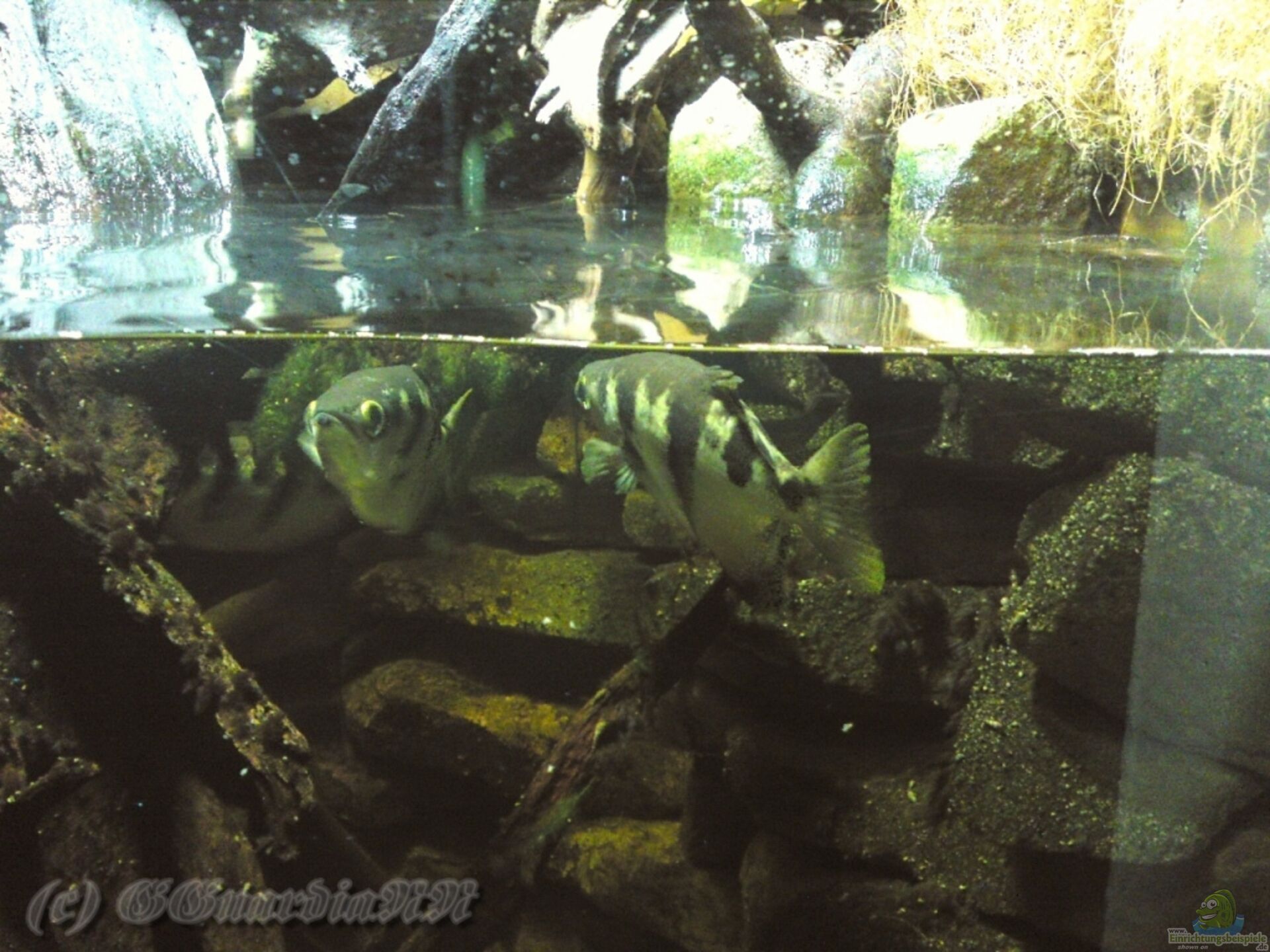 Haltung: In einer Gruppe von mind. 5 Tieren, da es sich bei Toxotes um einen Schwarmfisch handelt. Der Schützenfisch hält sich seine gesammte Lebenszeit im Brackwasser auf. Für die Haltung im Aquarium sollte das Becken möglichst nur zu 1/3 gefüllt sein, über dem Wasserspiegel sollten sich auch noch einig ??ste befinden, auf die sich die Beute/Nahrung, wie z.B. Fliegen, niederlassen kann. Auf den Bodengrund braucht bei der Einrichtung nicht grossartig geachtet werden, am besten ein feiner Kies von 1-2mm, besser noch feiner Sand. Als weitere Einrichtung viele Wurzeln (am Besten Mangroven, kein Moorkien, da Sie das Wasser ansäuern !!!), die im Wasser stehen, oder Steine, das Aquarium sollte gut strukturiert sein, damit sich die Tiere bei ihren auftretenden Agressionen aus dem Weg gehen können. Auf den ??berwasserteil ist grosser Wert zu legen, da nur so die interessantte Jagttechnik der Schützenfische zu beobachten ist, fehlt dieser ??berwasserteil, geht diese wohl einzigartige Jagttechnik sehr schnell verloren.