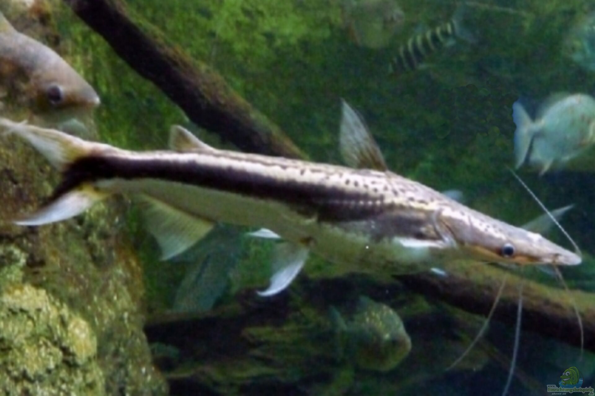 Haltung: Diese Welse benötigen ein sehr grosses Aquarium mit viel freiem Schwimmraum. Ausserdem benötigt er Unterstände in allen Wasserbereichen, am besten aus Wurzelholz, welches zum Teil auch senkrecht im Wasser stehen sollte, sodass die Tiere sich auch wie in freier Natur senkrecht (Kopf meist nach unten) an Gegenständen aufhalten können. Au??erdem wäre eine Bepflanzung und ein Schwimmpflanzenteppich , sowie eine nicht zu helle Beleuchtung sehr von Vorteil. Als Bodengrund sollte ein feiner Kies von 1-2mm, besser aber Sand gewählt werden. Das Aquarium sollte wie schon gesagt viele Verstecke aus Holz oder auch Steinen und Höhlen besitzen, die geräumig genug sind, eine Gruppe dieser Tiere aufzunehmen. Wegen der starken Nachtaktivität sollte evtl. für eine nächtliche Beleuchtung gesorgt werden, damit die Tiere nicht so oft mit Ihren langen Barteln die Ruhe der anderen Beckenbewohner stört.