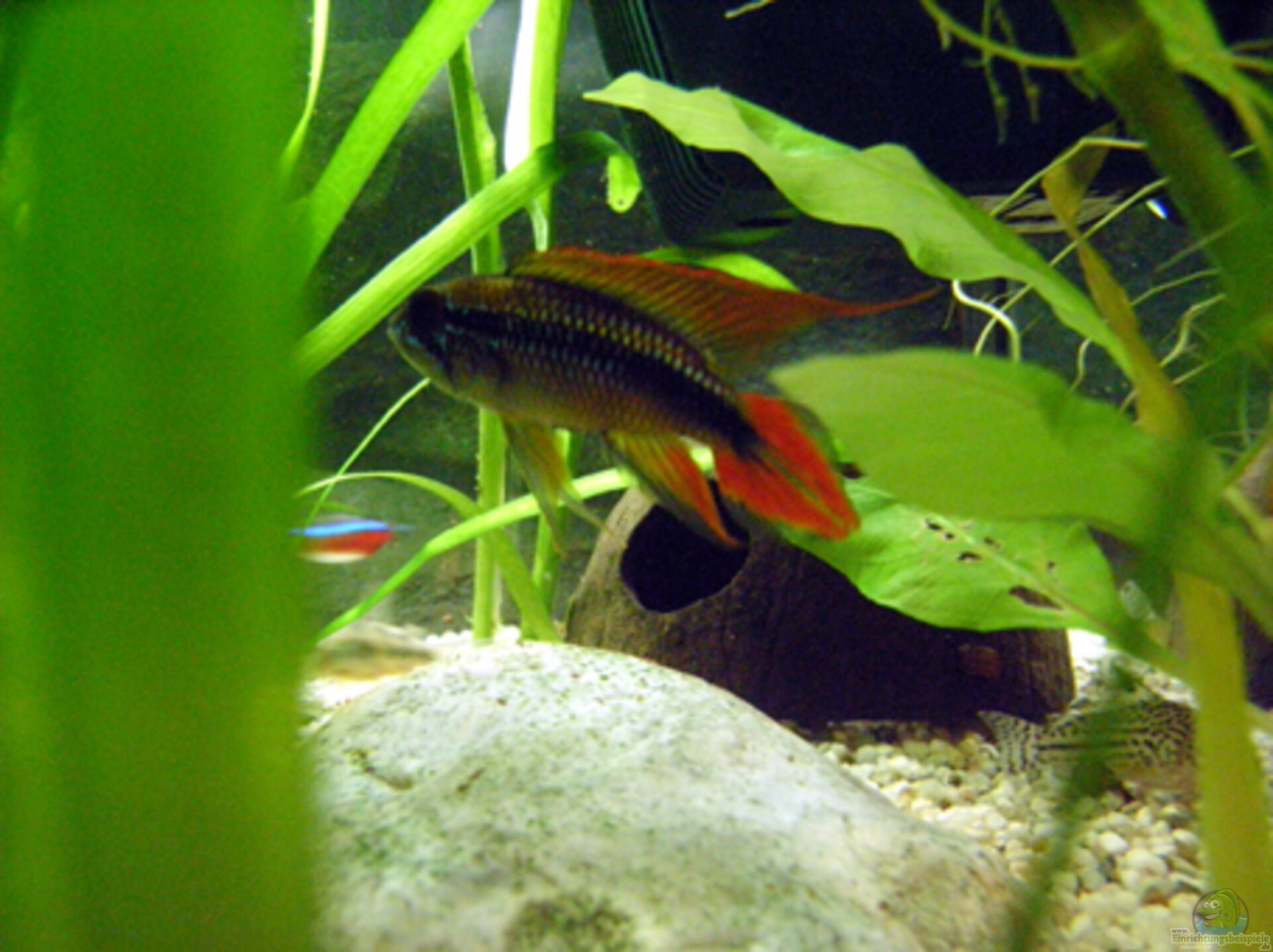 Haltung: Die Haltung ist bei richtiger Wasserqualität unproblematisch.Der Boden sollte aus feinem Kies oder Sand bestehen, da sie vor Höhlen, deren Eingang über dem Boden liegen (z.B. Kokosnuss mit Eingang, der recht hoch liegt), eine Art Treppe bauen, wenn sie laichen.Eine dichte Bepflanzung an einigen Stellen sollte vorhanden sein, genauso wie einige Höhlen an verschiedenen Orten.Bei einer Haltung im Harem, die erst ab 120 Liter gemacht werden sollte, sind Reviergrenzen ganz wichtig, da sich sonst gleichgeschlechtliche Tiere untereinander so stark bekämpfen, bis der schwächere stirbt.Paarweise ist eine Haltung mit wenigen Beifischen schon in einem Becken mit ca. 80 Liter Inhalt möglich.