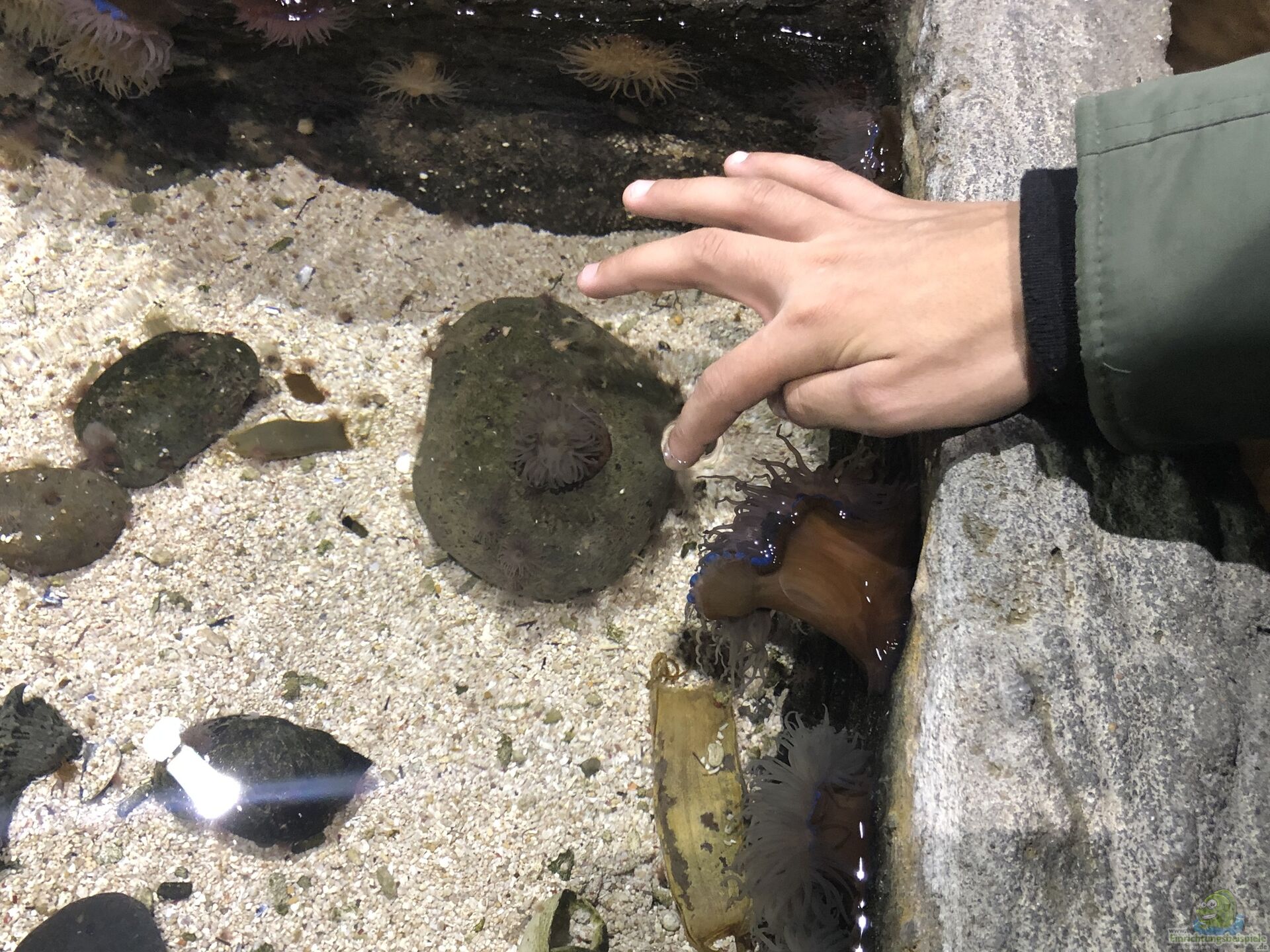 Mir gefiel au??erdem auch der Raum, in dem einer der Mitarbeiter vor allem für Kinder die Anemonen und Garnelen erklärte und zeigte, wie die Fütterung funktionierte. In diesem Raum befand sich au??erdem ein Becken, das ich klasse fand. Es war eine Art Hafen nachempfunden, mit Treppen und Türe im Aquarium, Gitter-Fenster und teils recht gro??en Fischen, die sich in einem ständig wechselnden Wasserstand behaupten mussten. Das fand ich eine tolle Idee und man hatte das Gefühl, dass sich auch die Fische recht wohl fühlen könnten ??? dies machte ich anhand der Körpersprache und des vitalen und farbenprächtigen Aussehens der Tiere fest???