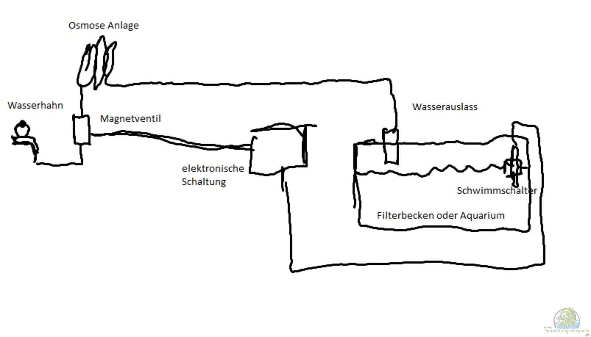 Sinkt der Wasserspiegel im Becken schlie??t der Schalter im Schwimmer und sendet ein Steuersignal wird das Magnetventil geöffnet und das Wasser flie??t nach, sofern die Hähne an der Osmoseanlage richtig gestellt wurde. Schwimmt der Schwimmer bis zum gewünschten Wassterstand auf wird das Steuersignal unterbrochen und das Magnetventil mit einer Verzögerung von 60 Sekunden abgeschalten, der Wasserfluss ist unterbrochen.
