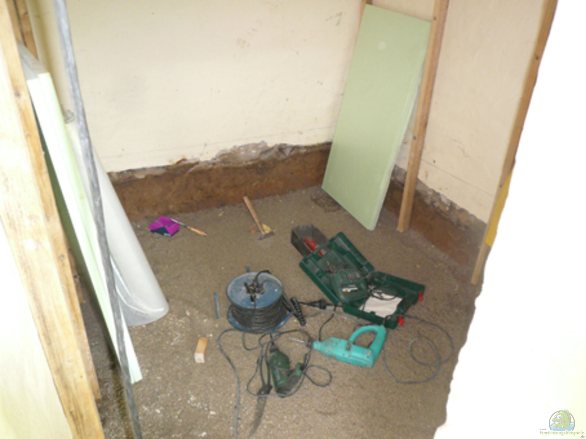 Zunächst ging es daran, die Stehhöhe zu erhöhen, um mehr Aquarien unterzubringen. Insgesamt wurde der Boden gute 70 cm tiefer gelegt. Das schafft zum einen eine tolle Stehhöhe von 2 Meter, zum anderen Platz für einen stabilen Boden. Das Ganze war eine dolle Plackerei, hat sich aber gelohnt, da die Stehhöhe sonst nur rund 1, 35 Meter gewesen wäre.