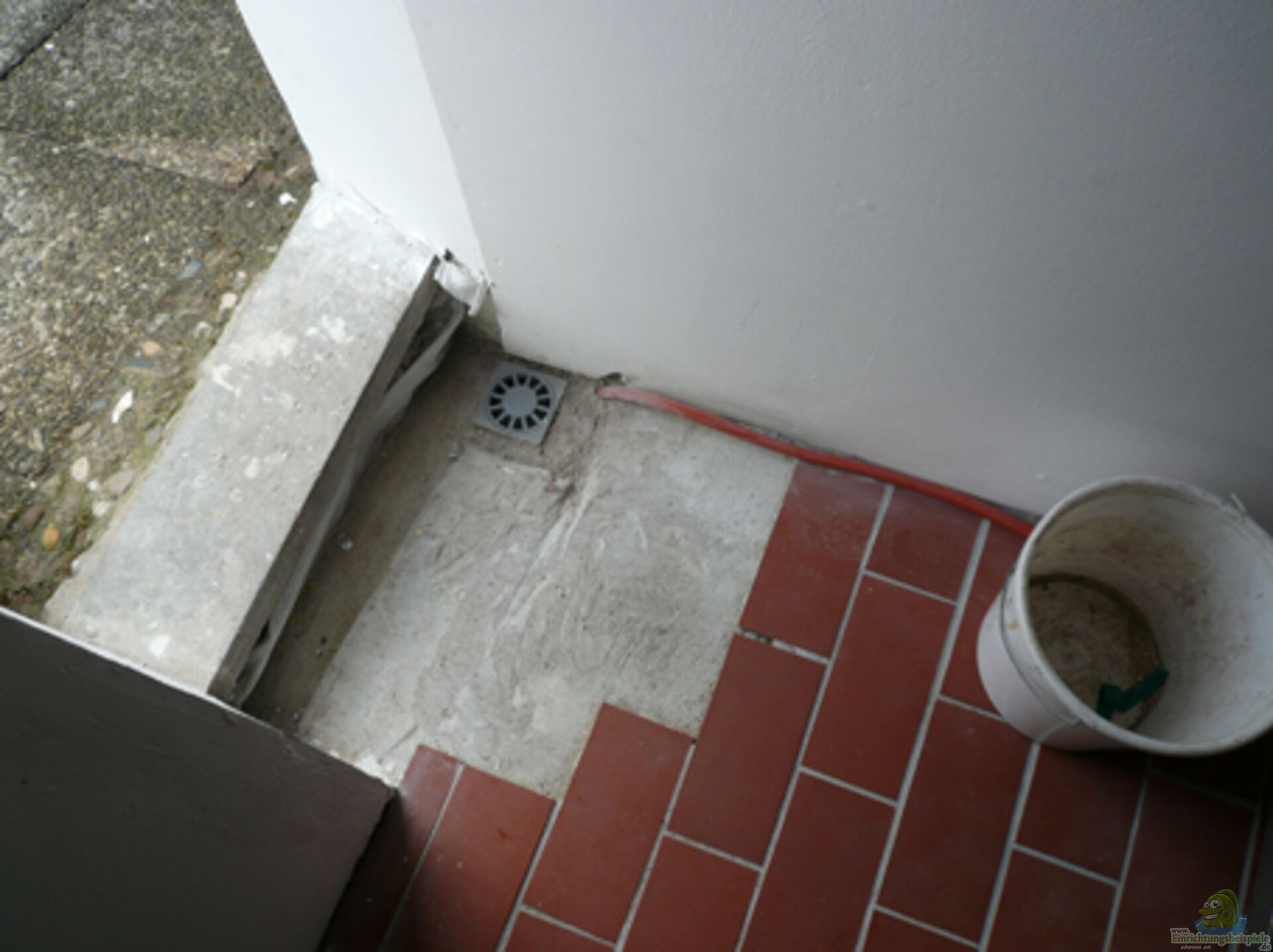 Beim Boden entschied ich mich für ganz normalen Beton, der in einer Dicke von 17 cm aufgebracht wurde. Nach dem Trocknen flieste ich den Raum mit einfachen Tonfliesen, da diese günstig und robust sind. Beim Boden plante ich einen Abfluss neben der Tür. Dafür wurde einfach eine Fläche von 15x15 cm vor dem Beton geschützt. Da durch das Absenken des Bodens eine Stufe entstanden war, war der Durchbruch unter dieser Stufe durch nach drau??en einfach. Der Einbau des Abflusses stellte kein Problem dar. Das Rohr wurde an das vorhandene Rohrsystem im Garten angeschlossen, sodass das Wasser direkt in die Kanalisation laufen kann. Zusätzlich legte ich einen Schlauch von drinnen nach drau??en, um drau??en einen Gartenschlauch anschlie??en zu können. Innen wurde ein Verteiler angebracht. Anschlie??end wurde der Hohlraum neben dem Abfluss mit Beton aufgefüllt und der Bereich gefliest und verfugt.