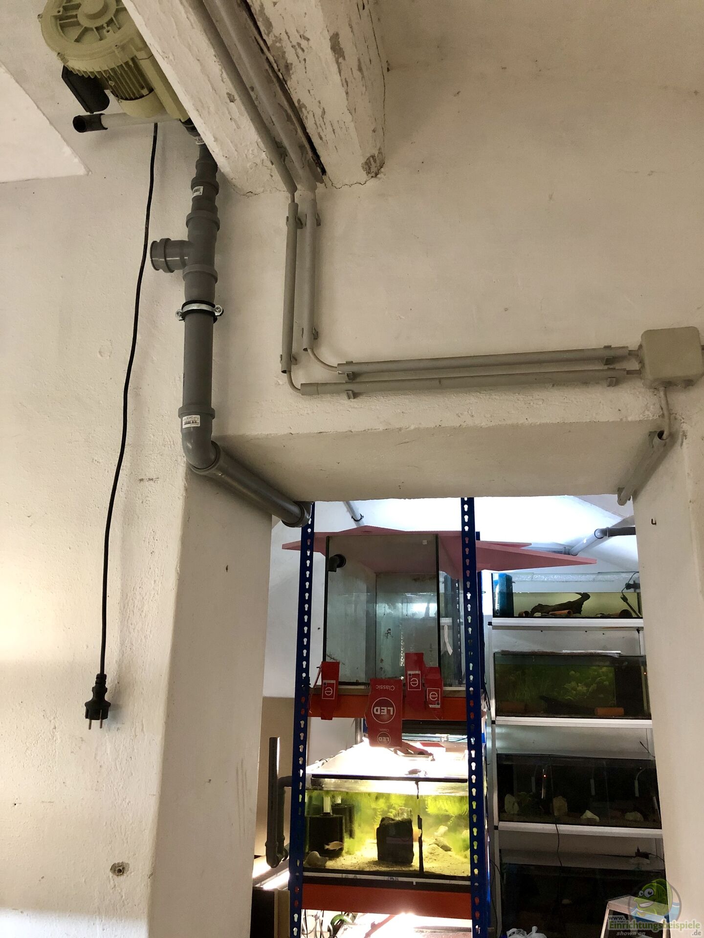 Es ist März 2019 geworden. Die Filter der Aquarien laufen momentan noch mit mehreren Membran-Pumpen bzw. habe ich Innen- und Au??enfilter (meist von Eheim) laufen. Zukünftig wird die Druckluft für die Lufthebefilter in den Aquarien allerdings von einer Ringleitung, die an der Decke der beiden Räume entlanglaufen wird kommen.