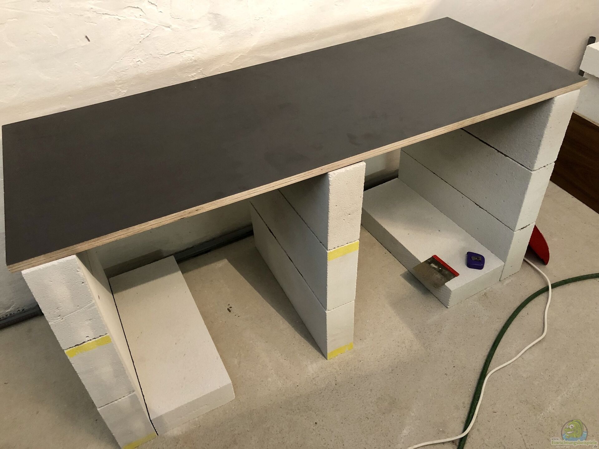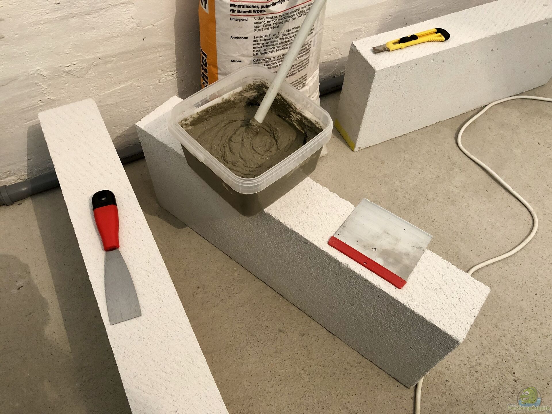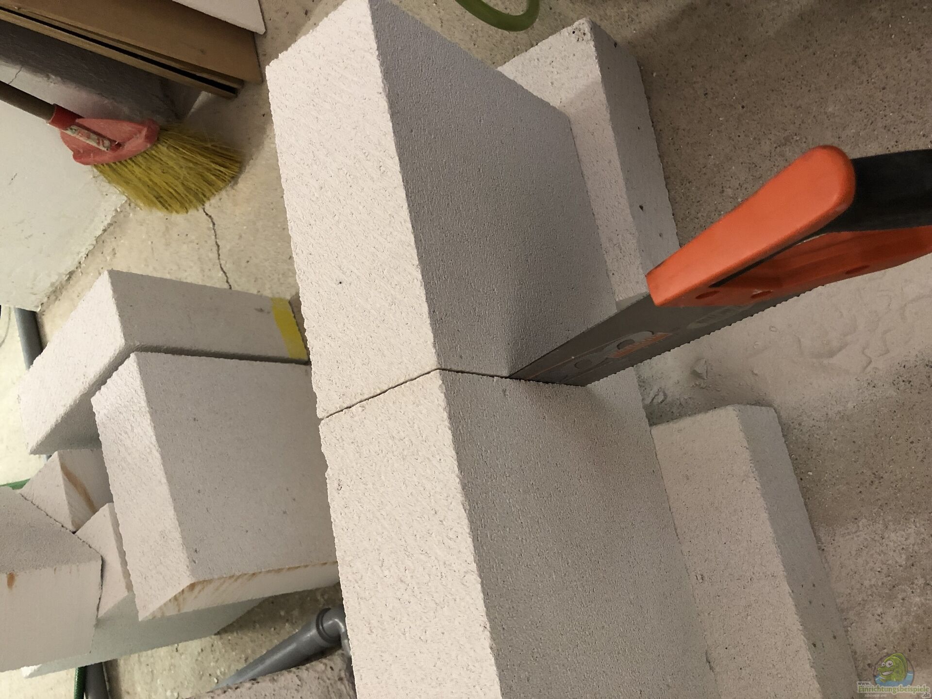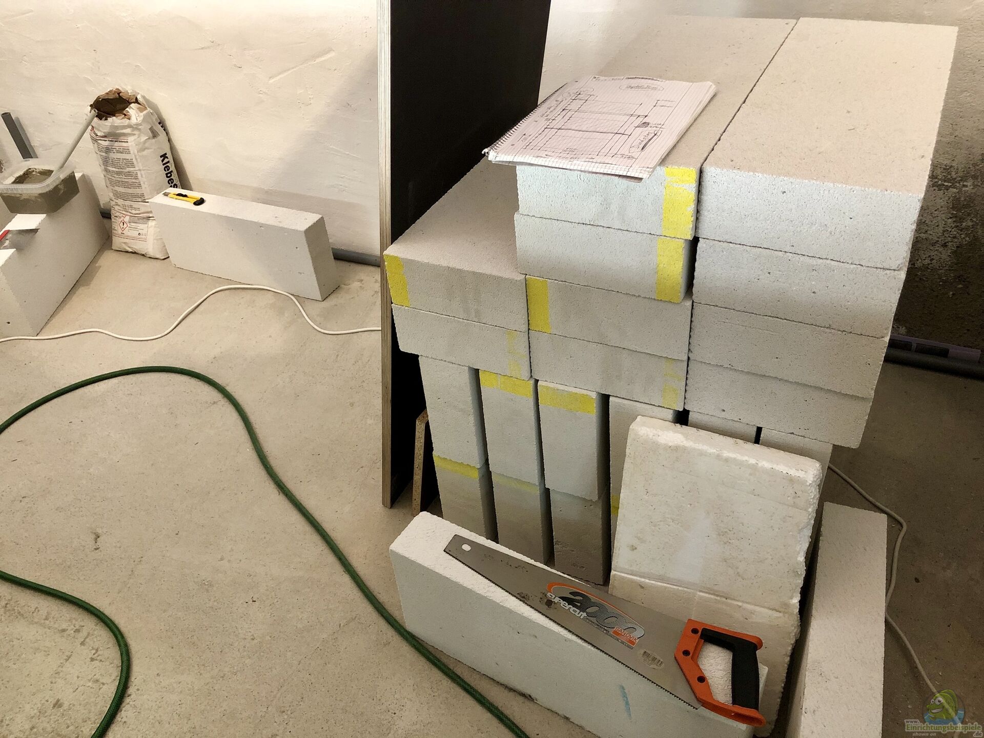 Zwischenzeitlich habe ich mich schon alleine ans Werk begeben und die Ytong-Bausteine bzw. die Ytong-Ziegel mit Klebespachtel-Masse zusammengeklebt. Es werden zwei Becken mit einer Grundfläche von 150x60cm bei einer Höhe von 60cm bzw. knapp 70cm Platz finden. Ein Ytong-Regal, das ich für drei 80x35x40cm Becken plane, wurde ebenfalls in Angriff genommen.
