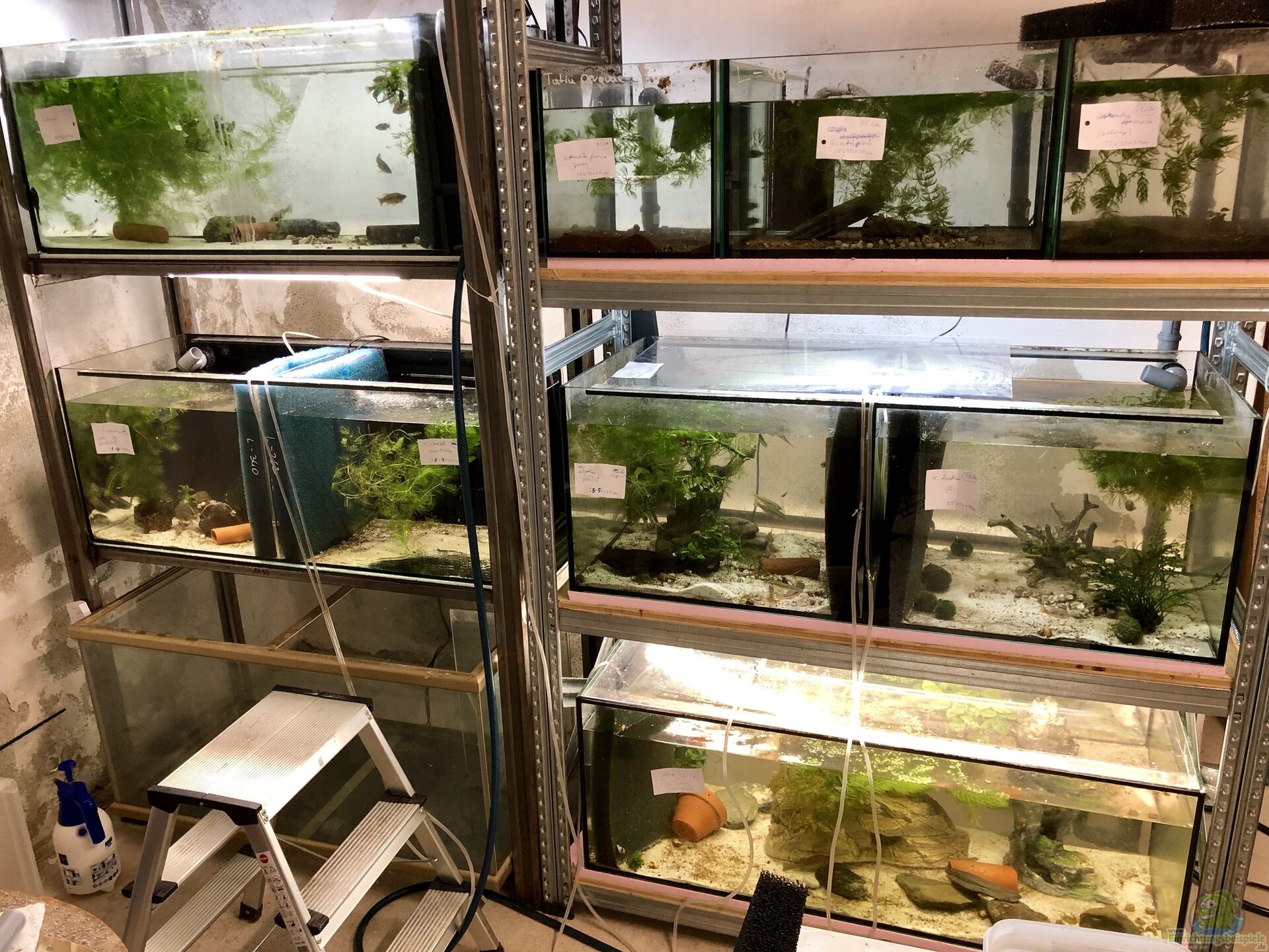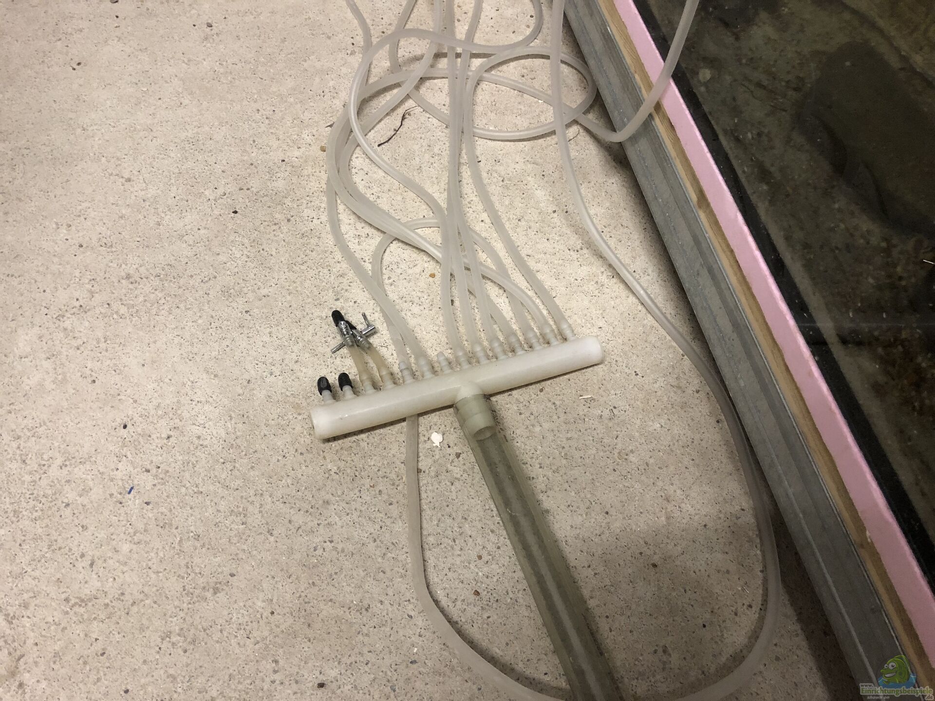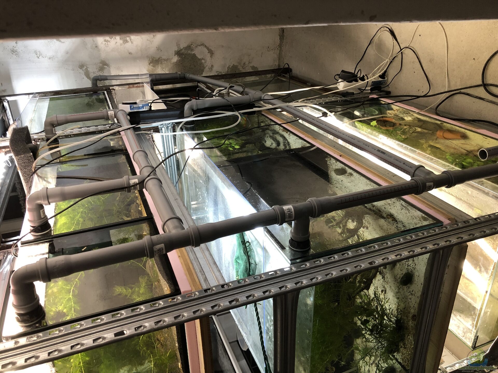 Da es noch keine Luft-Ringleitung gab, behalf ich mir mit Innenfiltern a la Eheim und Co. sowie einer Membran-Pumpe, die über längere Schläuche über die Vorderseite die Becken versorgte. Schön sah es ja nicht aus, doch wir mussten den Hinterbereich frei haben, damit wir die Ringleitung später bauen konnten???