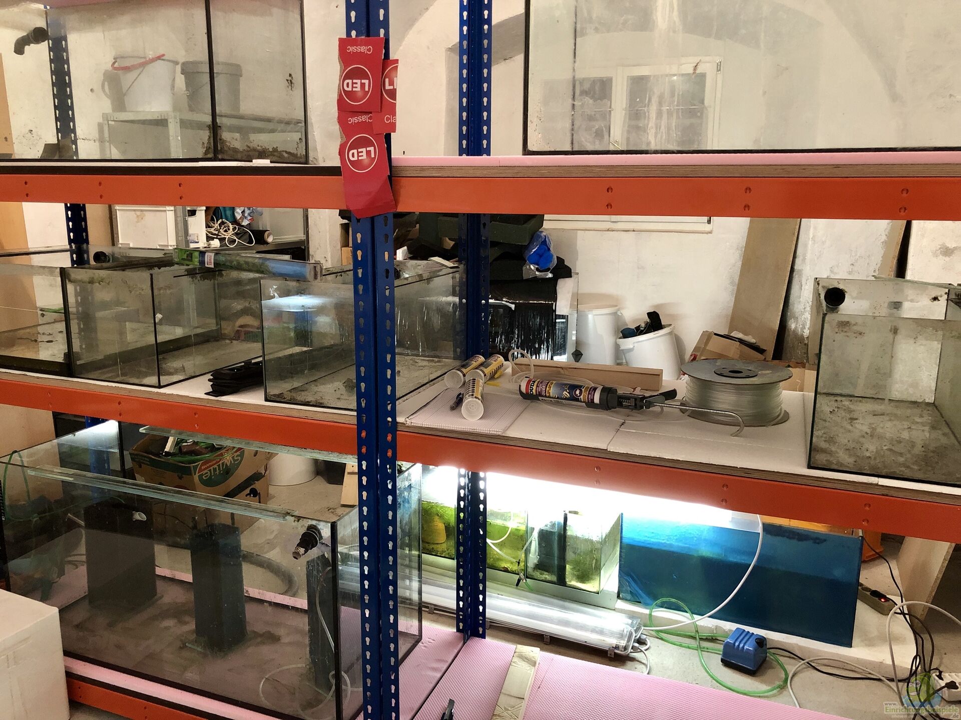Die ersten beiden Regale standen und liefen schon mehr oder weniger, wie sie sollten. Nun kam der zweite Raum dran. Dort wurden zwei gro??e Schwerlastregale (auf den Bildern sind das die Blau-Orangen Regale) mittig im Raum von der Hinteren Wand her aufgebaut. Dort plante ich die Ostafrika-Aquarien. Es mussten wieder die meisten Becken angebohrt werden, damit das Altwasser ablaufen konnte. Diese Arbeit ist recht Kräftezehrend und dauert auch seine Zeit. Mein Kollege Alois bohrte ein Becken nach dem anderen und ich stellte sie, meist mit Hilfe meines Bruders in die Regale.