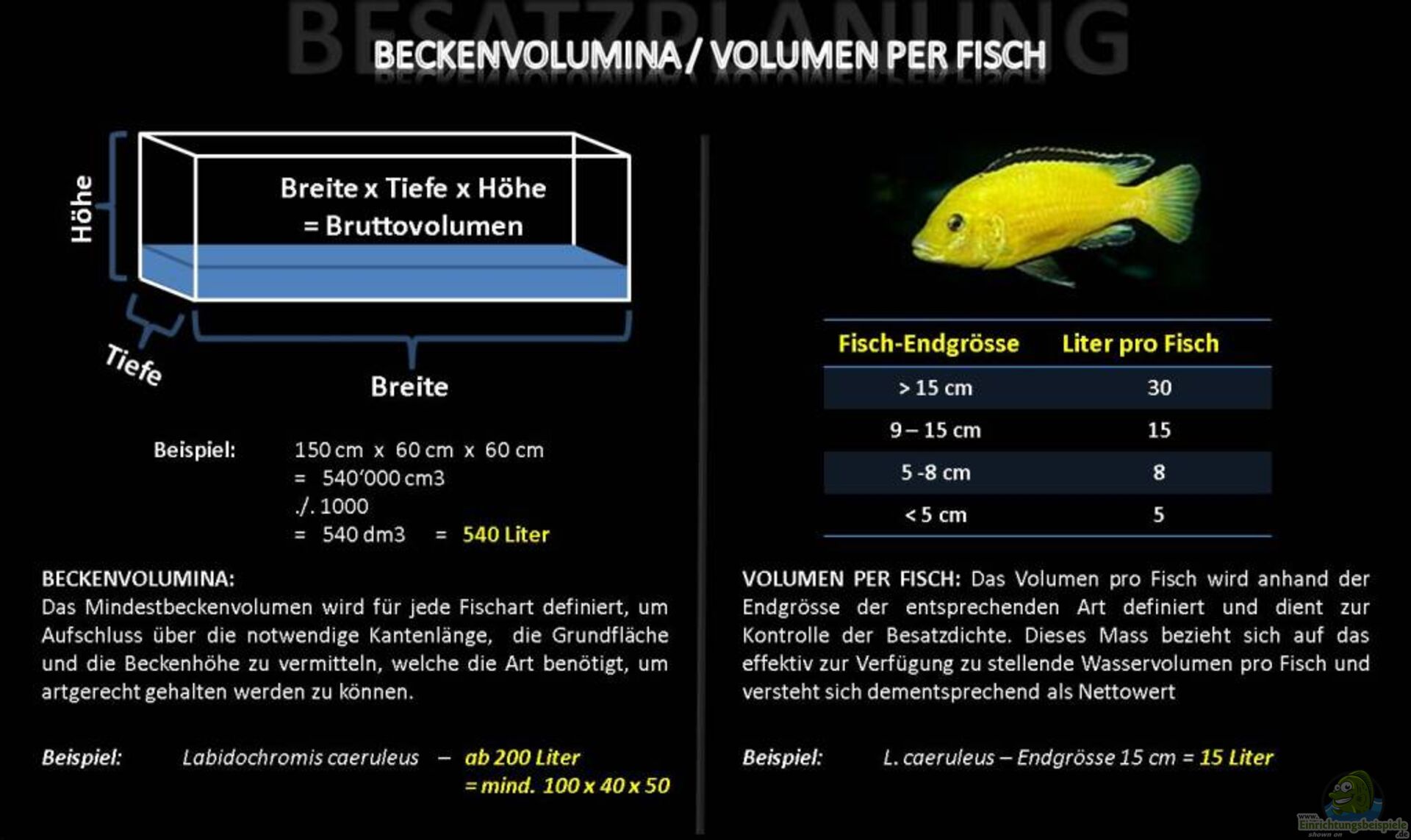 In diesem sind abgeleitet die angesprochenen Dekos im Becken abzuziehen... was dann einen raum in der Wassermenge teilbar macht, also unter bezug auf Sauerstoffregeneration usw. allen anderen fakten eineLiter /pro Fisch-Angabe erfolgen kann...