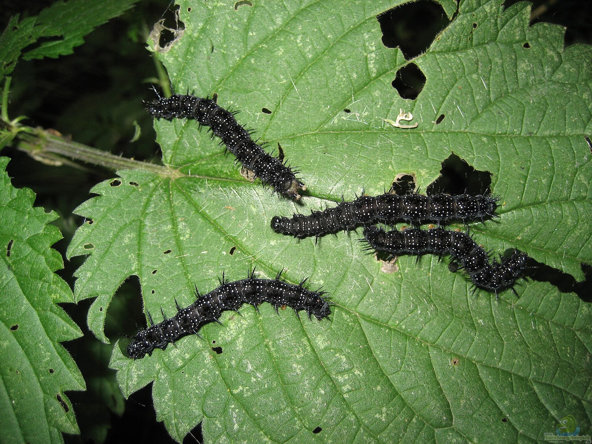 Die Raupen sind schwarz, mit kleinen weißen Punkten übersät und haben zahlreiche feine Stacheln. Sie leben meist in Gruppen auf der Unterseite der Brennnesselblätter.