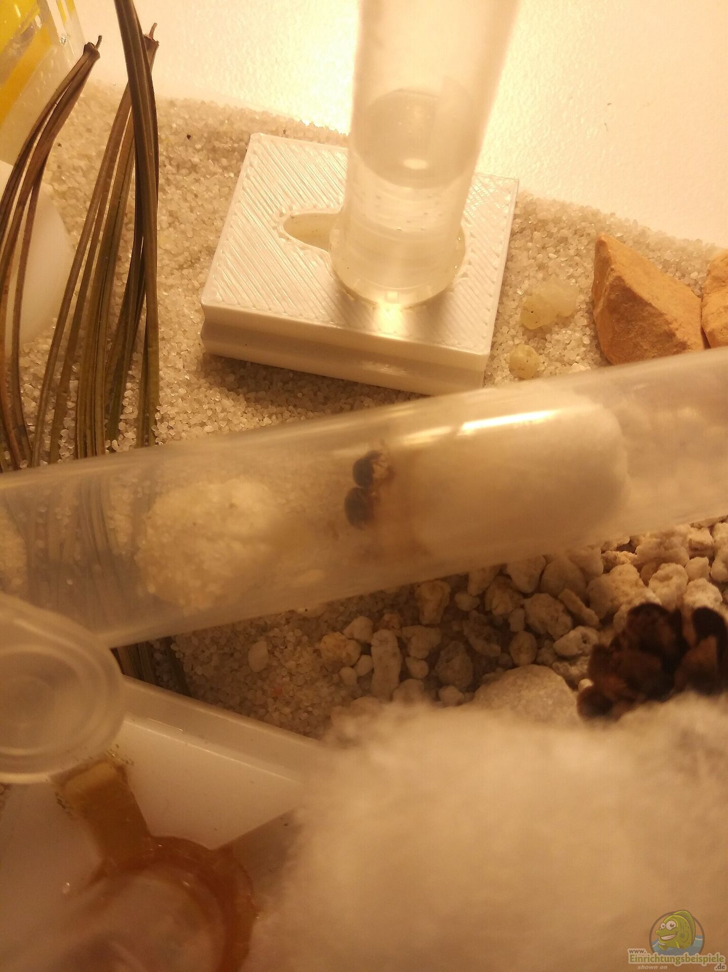 Sobald die ersten Arbeiterinnen geschlüpft sind, beginnt die junge Kolonie damit, Nahrung aufzunehmen. Dann kann das Reagenzglas an ein kleines Formicarium angeschlossen oder in eine Arena gelegt werden, in der erste Ausflüge möglich sind. Das Glas bleibt oft über viele Wochen das Zentrum der Kolonie, bis ein Umzug ins Hauptnest erfolgt.