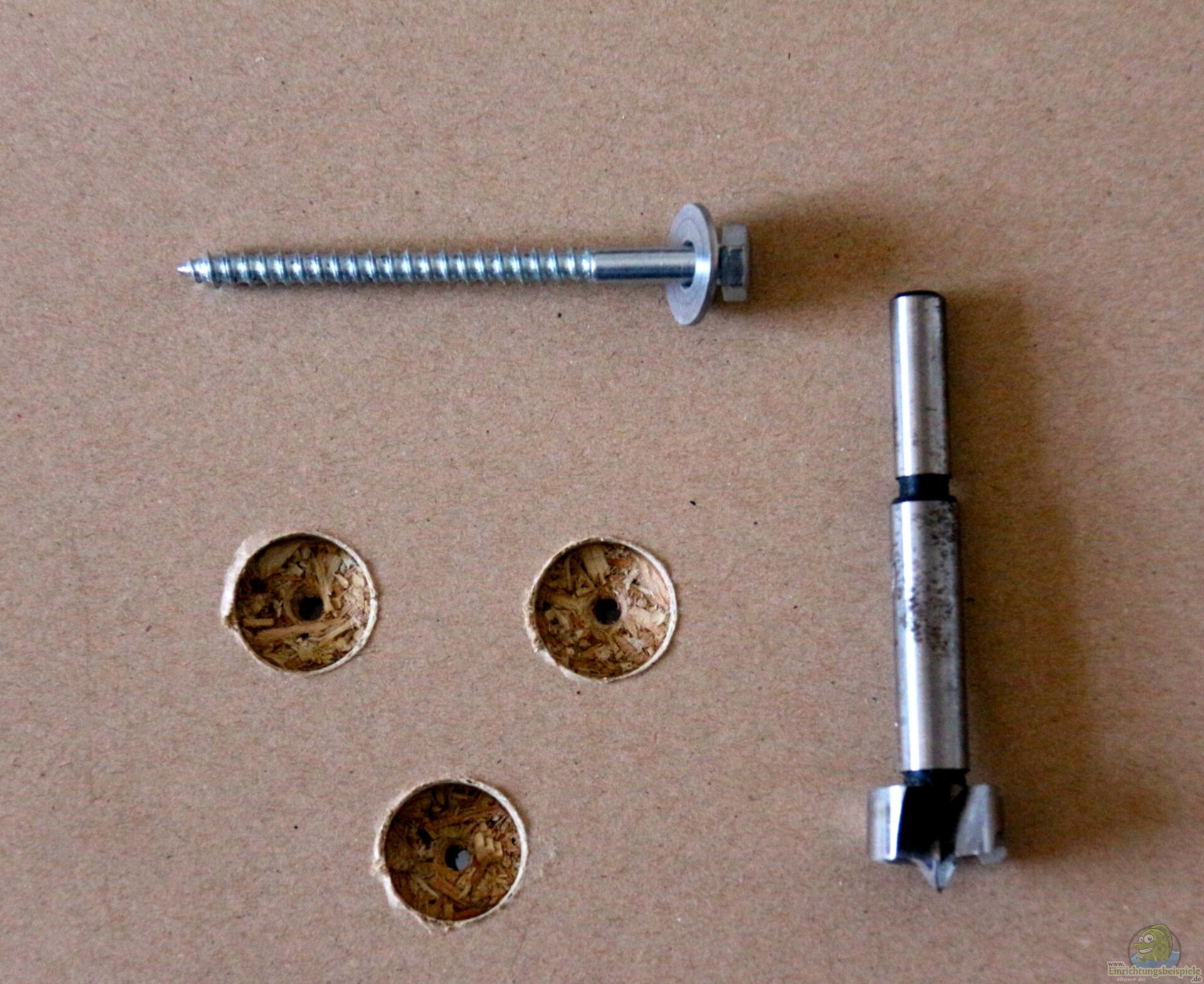 Nun geht???s ans ???eingemachte???. Auf der Ober-und Unterplatte den Grundriss genau aufzeichnen. Bohrlöcher anzeichnen und bohren. Schablone für die Bohrlöcher anfertigen und auf die Kopfseiten der Kanthölzer übertragen. Ich verwende Sechskantschrauben 6 x 80mm und damit die Kanthölzer nicht platzen bohre ich vor und versenke die Schrauben mittels Forstner-Bohrer in der Ober-und Unterplatte (Foto 2).