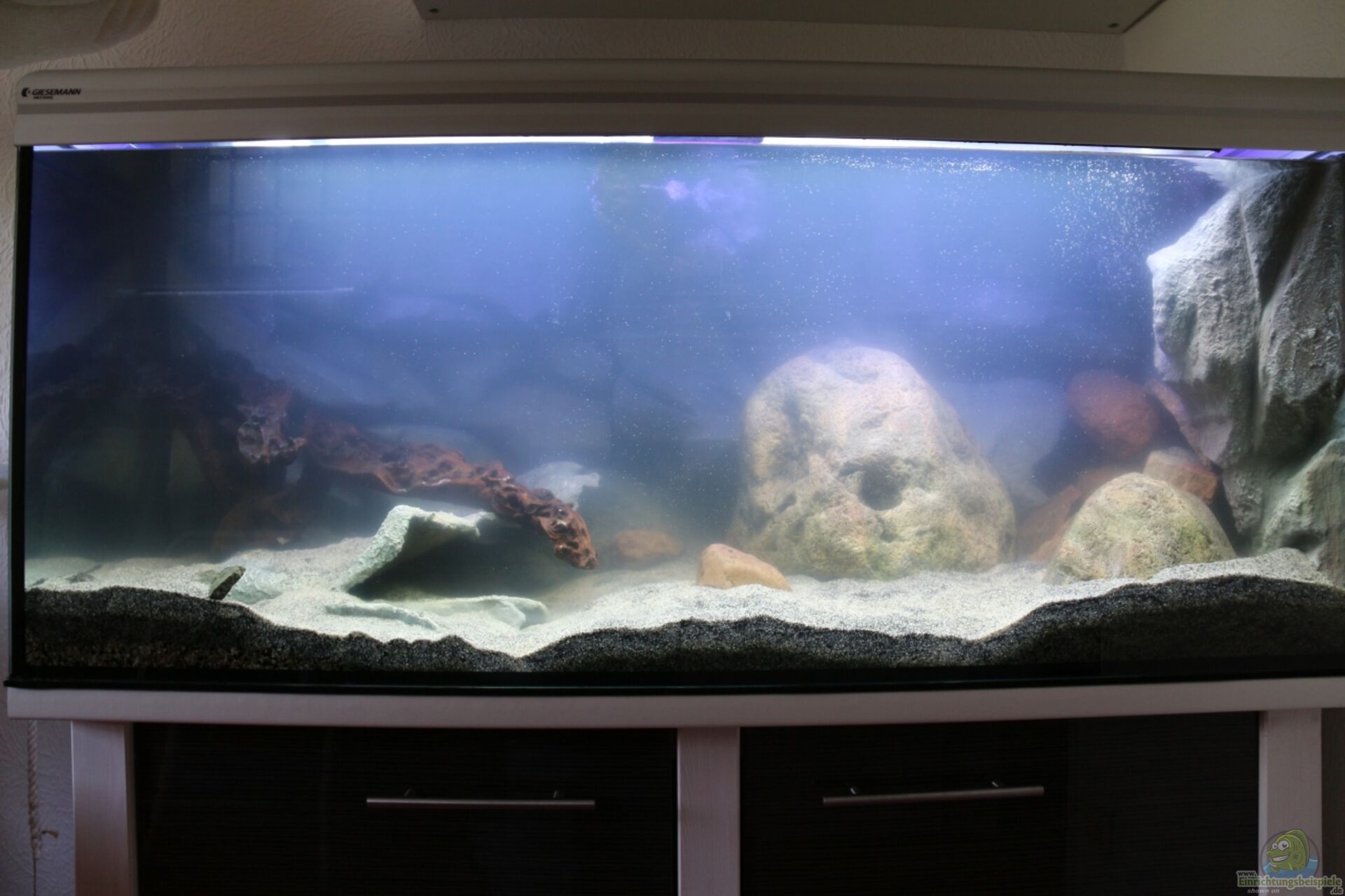Mit dem Dekorieren habe ich, nach dem Einkleben der Rück- und Seitenwand, fast die ganze letzte Maiwoche verbracht. Steine rein, Steine raus ??? Riffplatten rein, Riffplatten raus und alles wieder von vorn. Als ich es für gut befand kamen die Rockzolid Module. Den gro??en River Stone J (56x39x34) in zwei Teile (1/3, 2/3) mit der Flex zerteilt und hintere Bereiche freigeschnitten. Somit sind die Teile auch hinterschwimmbar. Das Rockzolid Stone Module D (32x13x13) wurde mit Kabelbinder unter die mittlere Querstrebe befestigt. Alles nochmals neu arrangiert und mit 35 Kilo gemischtem Sand befüllt (25 Kilo beiger Sand 0, 7-1, 2 und 10 Kilo schwarzer Aquariensand 0, 4-0, 6). An der linken Beckenseite will ich wenige Vallisnerien pflanzen und habe deshalb ca. 3cm hoch groben Kies eingebracht ( 1-2mm).