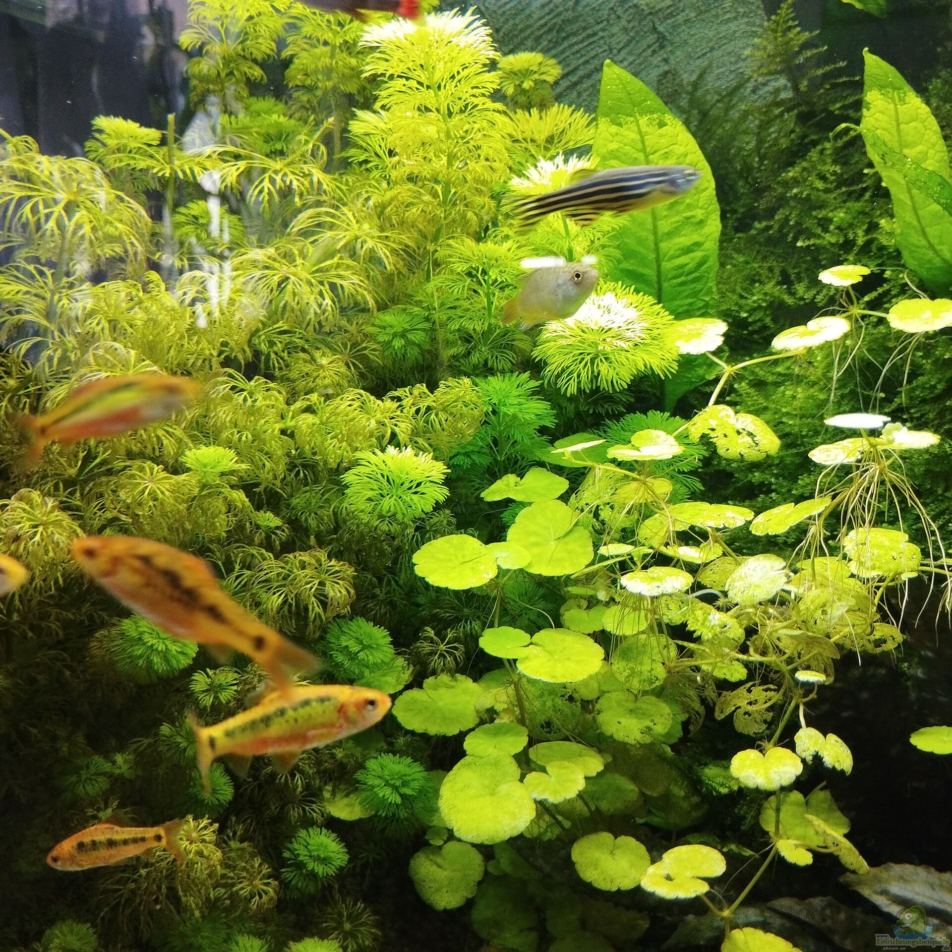 Vordergrundpflanzen sind die niedrig wachsenden Stars, die den Boden bedecken und eine beeindruckende Tiefenwirkung erzeugen. Sie bilden oft dichte Teppiche und sind das Markenzeichen vieler Aquascapes. Zu den beliebtesten Vertretern gehören Glossostigma elatinoides (Australisches Zungenblatt), Hemianthus callitrichoides 'Cuba' (Kuba-Perlkraut) und Eleocharis acicularis 'Mini' (Zwerg-Nadelsimse). Diese Pflanzen sind in der Regel recht anspruchsvoll und benötigen intensives Licht, eine gute Nährstoffversorgung und oft eine zusätzliche CO₂-Düngung, um kompakt und dicht zu wachsen. Für Einsteiger oder Becken mit weniger Licht eignen sich langsam wachsende Alternativen wie Marsilea hirsuta (Zwergkleefarn) oder das kriechende Staurogyne repens.