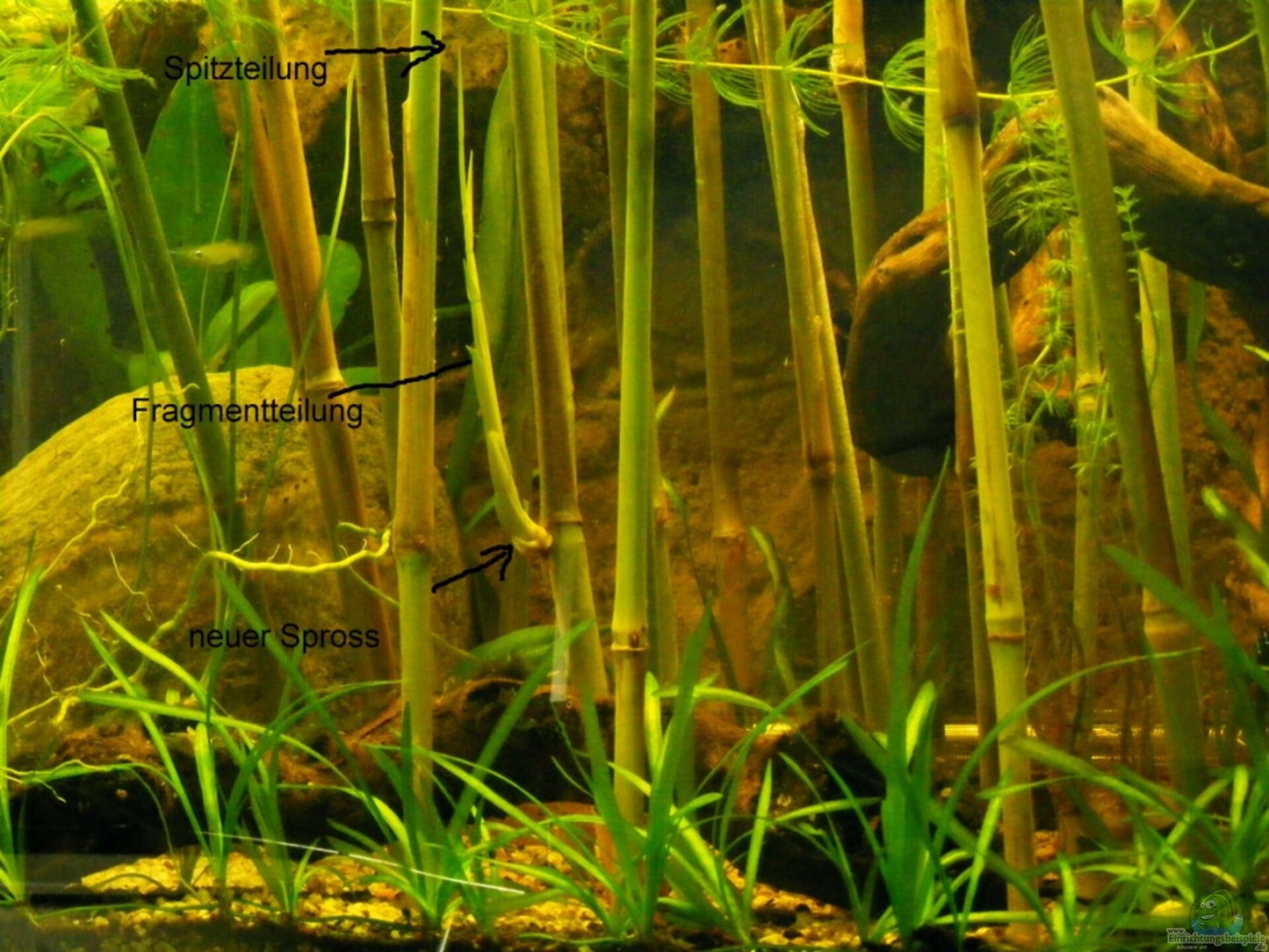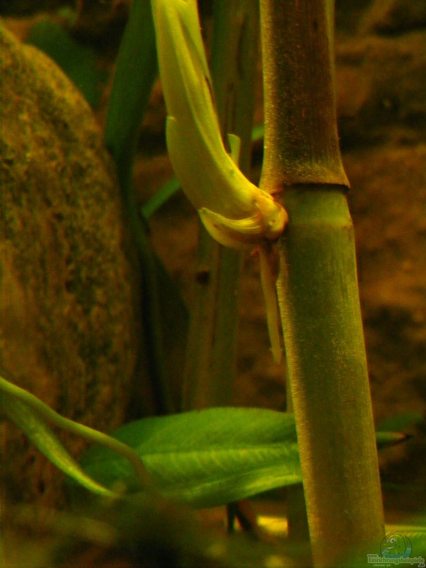 Das Schilfrohr für ein "Normalbecken" zu gro?? wird , denke ich wissen wir..aber auf Grund , das es sich bei mir im Becken mehr oder weniger ungewollt entwickelt, möchte ich so weit das möglich ist beibehalten und auch dokumentieren...mom. sieht es so aus , das ich , weil die Internodien ca. 10cm über Sediment liegen , sich eine massive rizhomäre Teilung der Wurzel aus dem "Knotenpunkt entwickelt und wie zu sehen aus einem Spross der mittlerweile weit über die Wasseroberfläche ragt sich weitere Sprosse bilden (selbriger Knotenpunkt) ...ich kann ebenfalls nur hoffen, das dies hier geschriebene auch vielleicht Interesse für die Pflanzenprofis wie auch Alternativen suchenden Pflanzenexperten und Paludariumbetreibenden Liebhaber weckt...