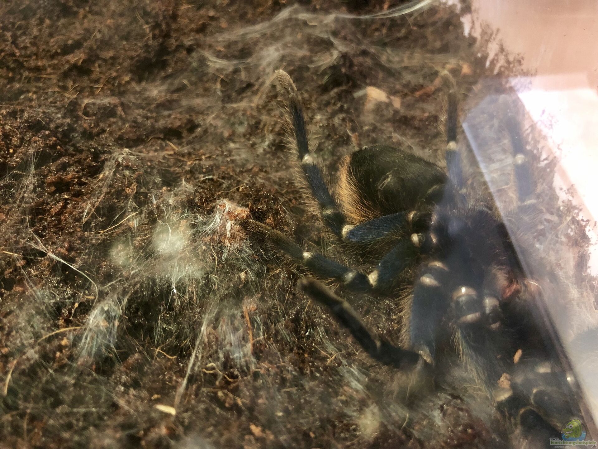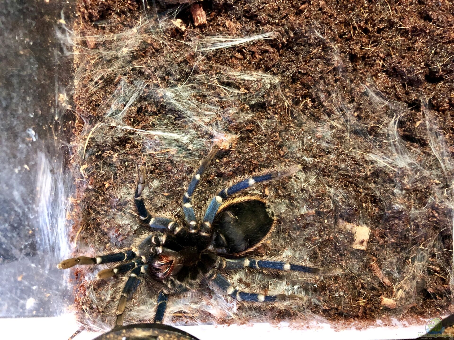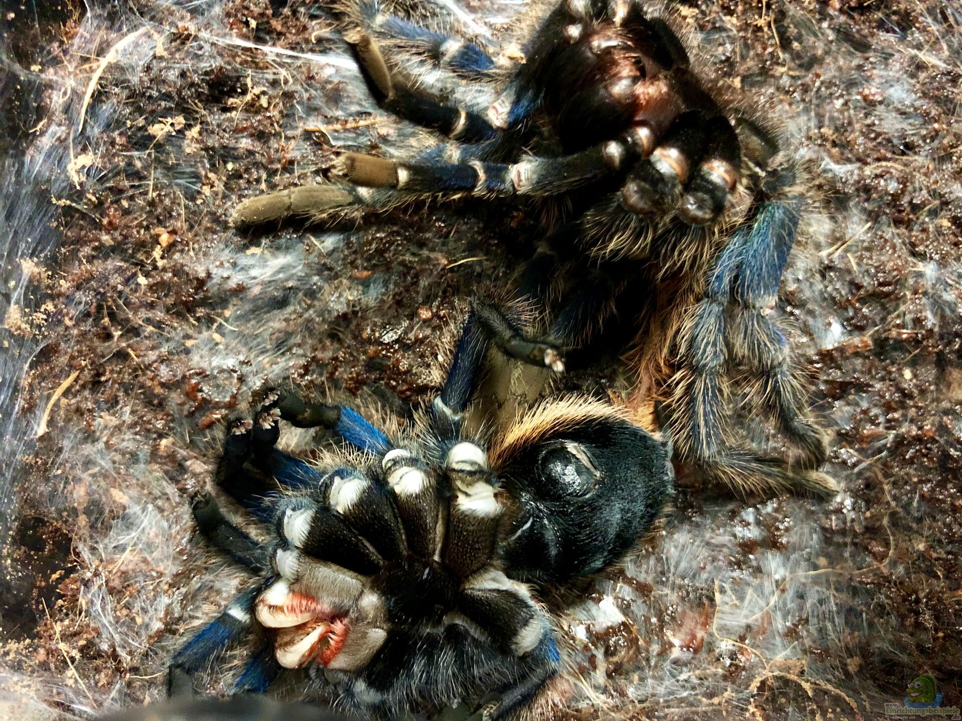 Auf den Bildern und im Video sieht man meine Chromatopelma cyaneopubescens. Es ist ein Weibchen, das sich seiner Haut entledigt. Hierzu hat sich das Tier einen Platz gesucht und diesen mit Spinnfäden ausgestattet. Anschlie??end hat sich die Vogelspinne auf den Rücken ???geworfen???, um so aus der Haut schlüpfen zu können. Hierzu ist die Spinne vermutlich an der Glaswand des Terrariums ein kleinwenig schräg hinaufgeklettert und hat sich dann auf den Rücken gedreht.