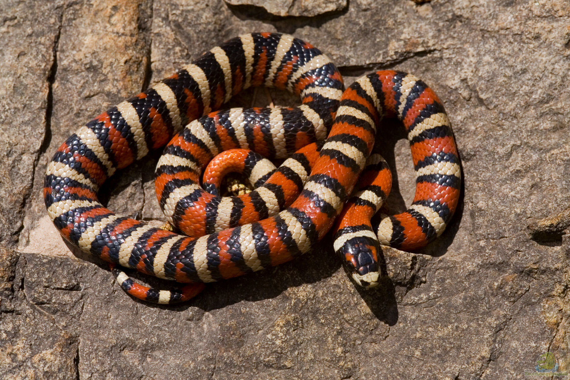 Lampropeltis pyromelana: Die Arizona Mountain Kingsnake ist in den südwestlichen Vereinigten Staaten beheimatet und zeichnet sich durch ihre leuchtend rote Farbe mit weißen und schwarzen Bändern aus.