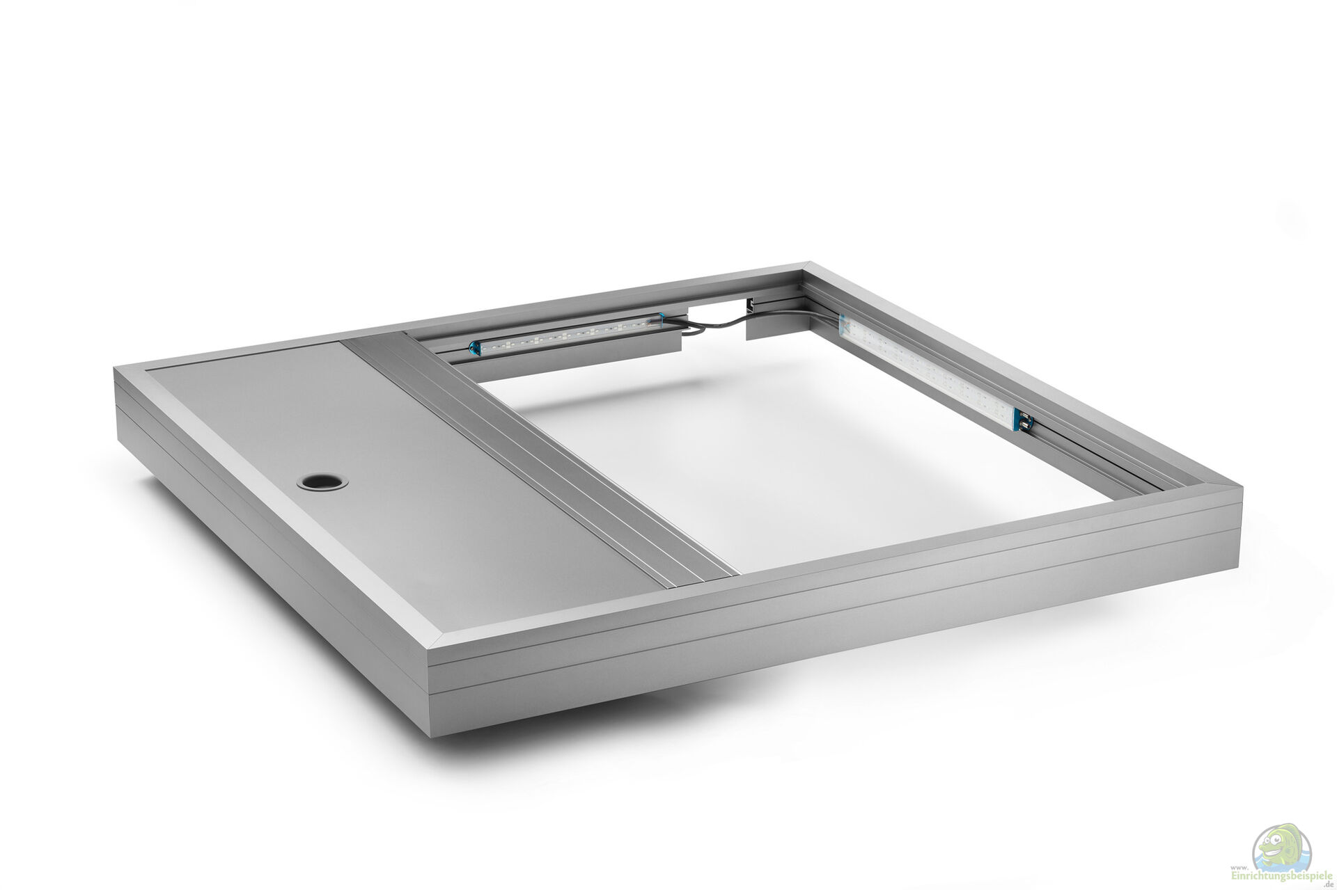 Das Design. Schlank. Funktional. Nicht nur optisch zeigt die Abdeckung eine klare Kante. Die durchdachten Rahmenprofile ermöglichen komfortable Deckelgrö??en und somit einen nahezu ungehinderten Zugriff auf das Aquarium. Die integrierte XL Schmutz- und Wasserstandsblende (-38mm zur Glasoberkante) sorgt umlaufend für ein sauberes und ungestörtes Blickfeld. Das Temperaturoptimierte Lichtprofil nimmt Abwärme ideal auf.