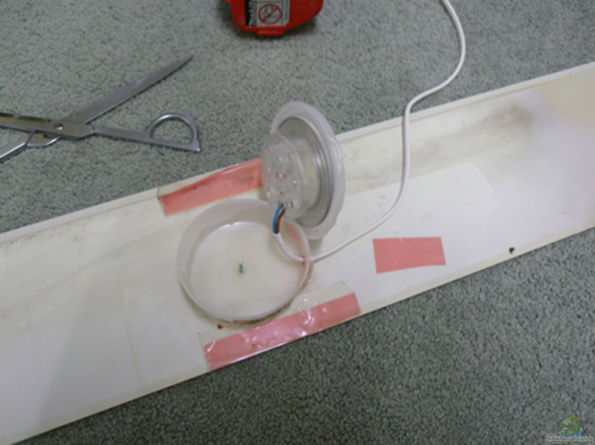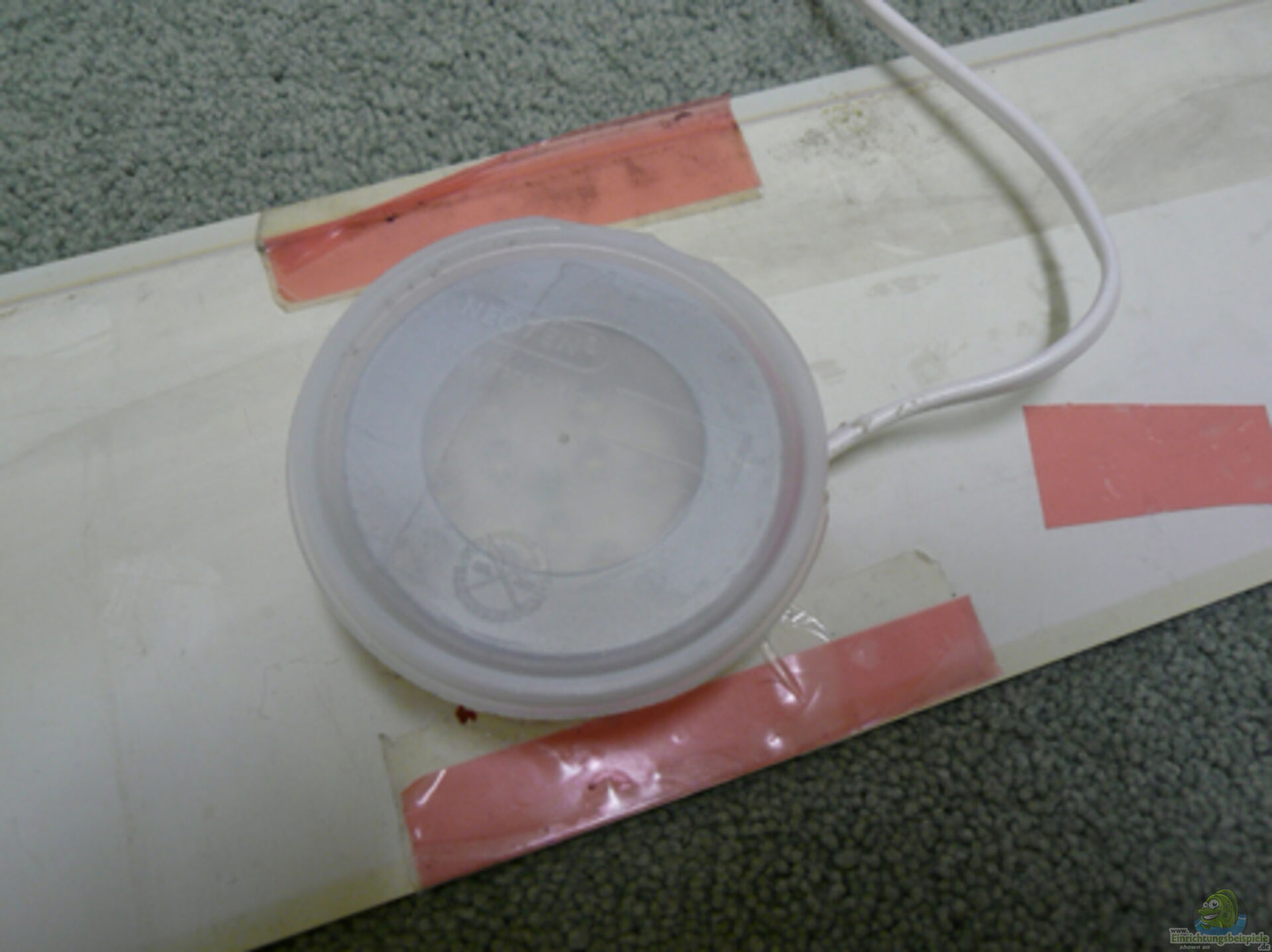 Mit Hilfe von doppelseitigem Klebeband wird der richtige Platz an der Abdeckung gesucht.Die Dose solle nicht ins Wasser (das sieht nacher hässlich aus) reichen.Ich habe mich für die hintere Klappe der Abdeckung entschieden.Die Dose wird solange bewegt, bis die Dose weder den Rahmen noch die Lampe des Aquariums berührt.Ist dieser Punkt erreicht, markiert man sich diesen Punkt durch das Loch in der Dose auf der Innenseite der Abdeckplatte.
