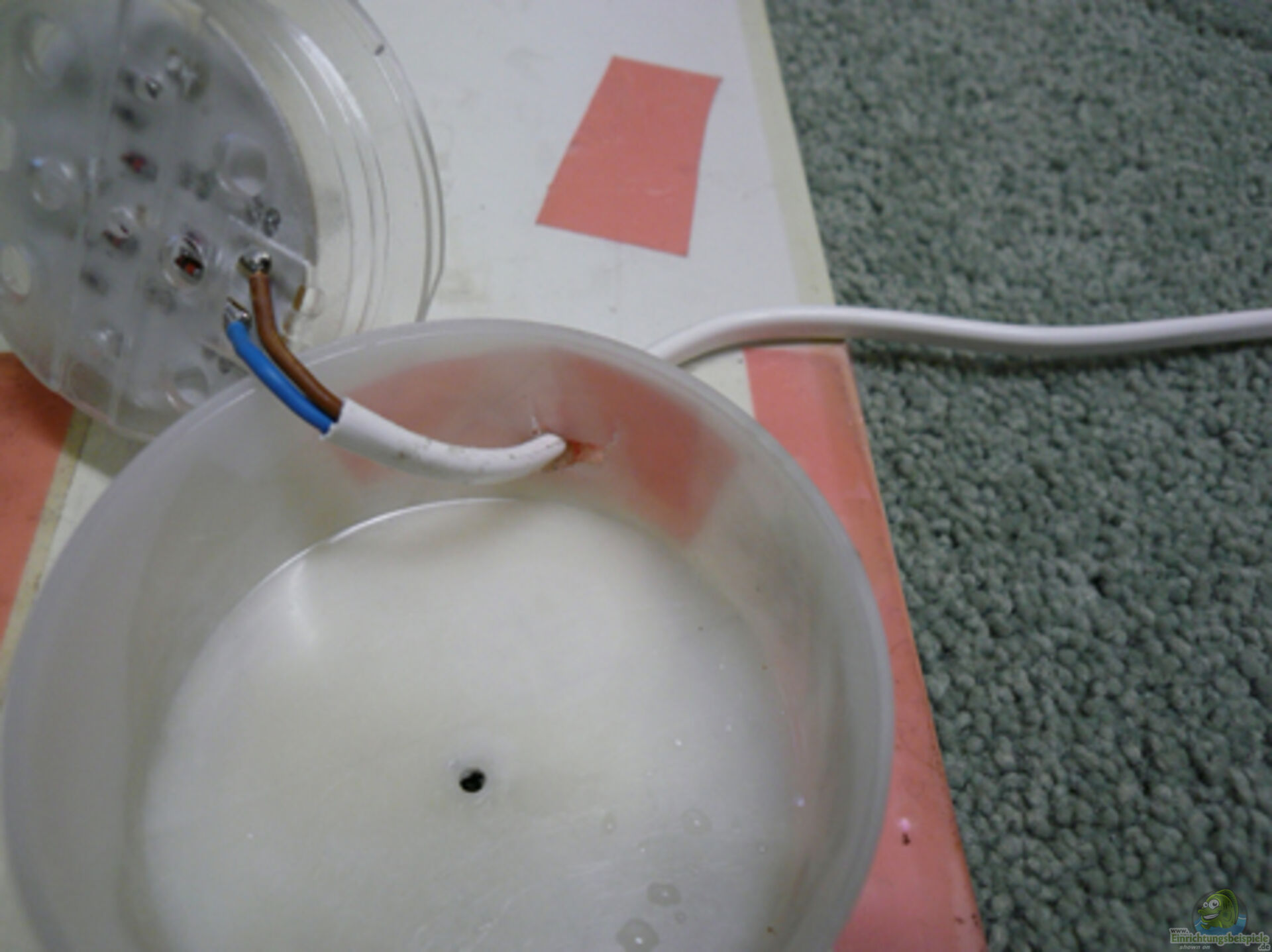 Genau dort, wo der Deckel der Dose aufhört, scheidet man ein kleines Loch für das Kabel. Dieses wird nach dem Aufsetzen des Deckels nit Aquariensilikon oder Knete abgedichtet, denn Wasser wollen wir nicht in unserem neuen Mondlicht.