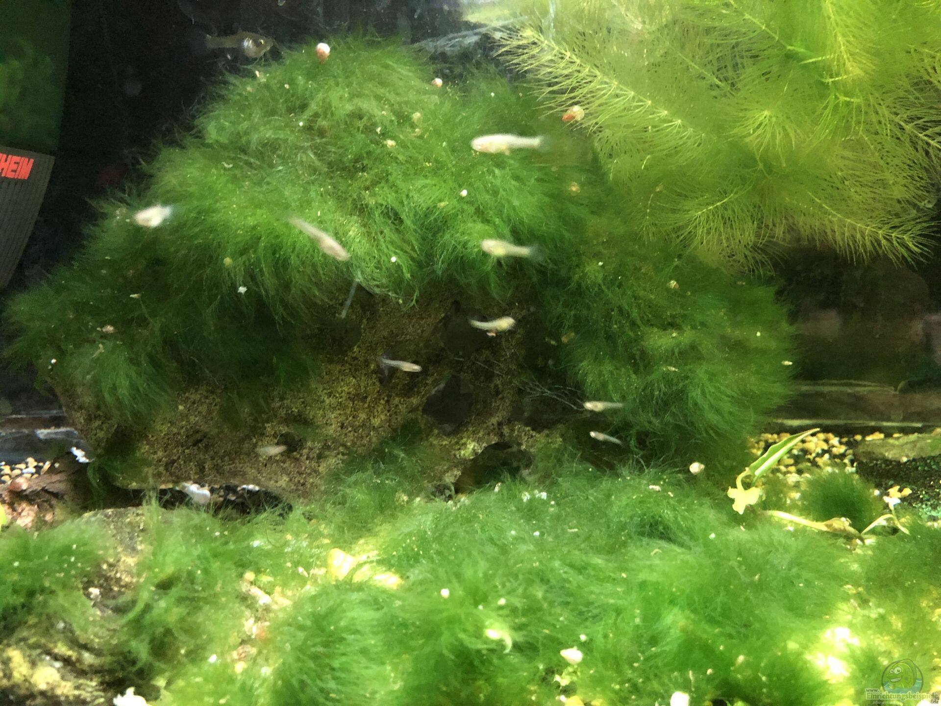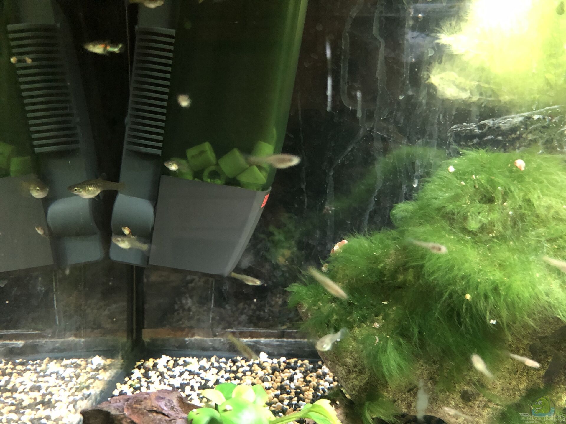 Das Endler Guppy Aquarium ist mittlerweile wieder gut mit Fischen ???gefüllt???. Das letzte Weibchen lebt und sorgt mit ihren drei Männern immer wieder für Nachwuchs. Die Jungtiere tummeln sich im Becken ??? ich glaube, es sind wieder über 25 Fische, die älter als ein Monat sind. Letzte Woche habe ich wieder Bakterien ins Becken gegeben und tags darauf sind einige neue Junge im Aquarium ???aufgetaucht???.
