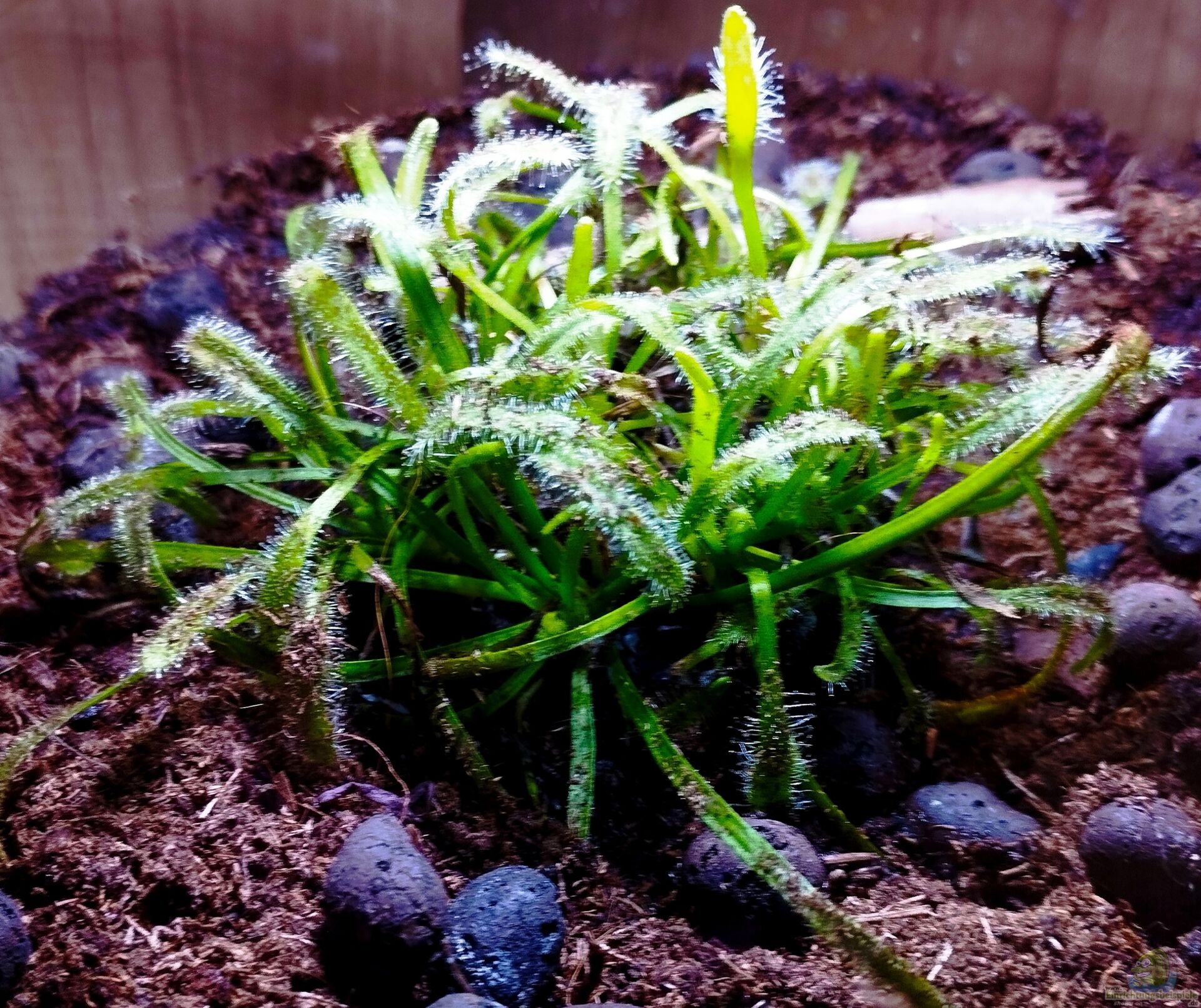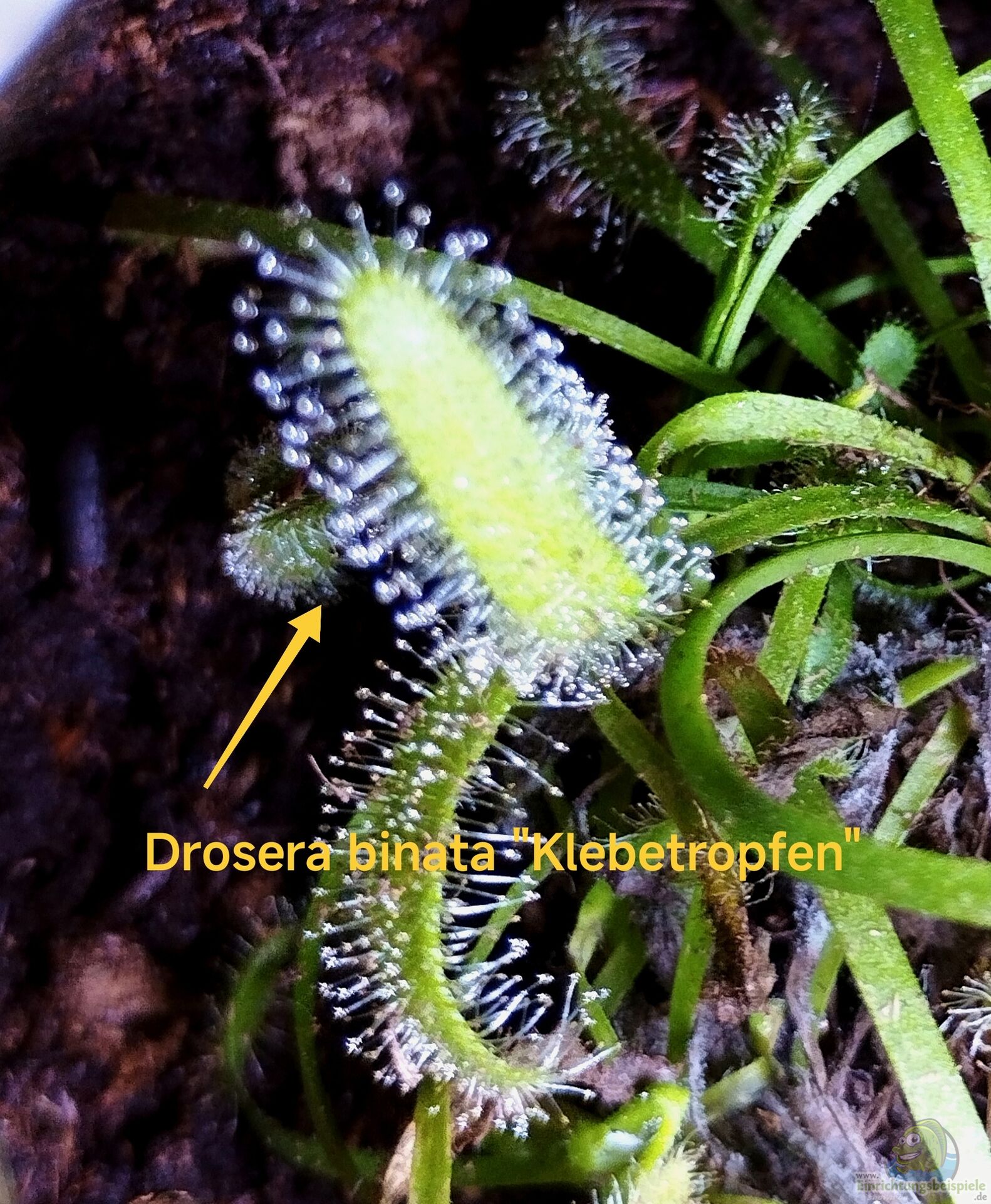 Drosera binata wird auch Gabelblatt-Sonnentau genannt und ist eine relativ pflegeleichte fleischfressende Pflanze, die vor allem hohe Luftfeuchtigkeit, viel Sonnenlicht und einen feuchten, sauren Boden zu schätzen weis. Eine angemessene Winterruhe ist für diese Pflanze wichtig, sie kann aber bei genügend Licht und Wärme durchkultiviert werden. Drosera binata benötigt einen sehr hellen Standort mit viel direktem Sonnenlicht oder ersatzweise eine entsprechende starke künstliche Beleuchtung. Im Sommer kann Drosera binata auch ins Freie, sollte aber sehr langsam an die Sonne gewöhnt werden, um Verbrennungen zu vermeiden. Eine hohe Luftfeuchtigkeit ist für Drosera binata sehr wichtig, daher ist ein Terrarium oder eine Karnivoren Vase perfekt für diese Pflanze geeignet. Als Substrat eignet sich für diese Pflanze eine Mischung aus Torfmoos, Weißtorf, Perlit und Sand. Gegossen wird Drosera binata mit Regenwasser, destilliertem Wasser oder Osmosewasser. Staunässe ist zu vermeiden, da dies zur Wurzelfäule bei der Pflanze führen kann. Das Substrat sollte leicht feucht gehalten werden. Drosera binata benötigt normalerweise eine Winterruhe um sich zu erholen und im Frühjahr wieder kräftig auszutreiben. Gewährt man der Pflanze eine Winterruhe, so sollte man sie kühler stellen (5°C-12°C) und weniger gießen. Im Frühjahr bekommt die Pflanze wieder mehr Wasser und wird an einen wärmeren, sonnigeren Standort verbracht, wo sie neu austreibt. Drosera binata kann durch Blattstecklinge oder Teilung vermehrt werden. Das ursprüngliche Vorkommen von Drosera binata ist Australien, Tasmanien und Neuseeland.