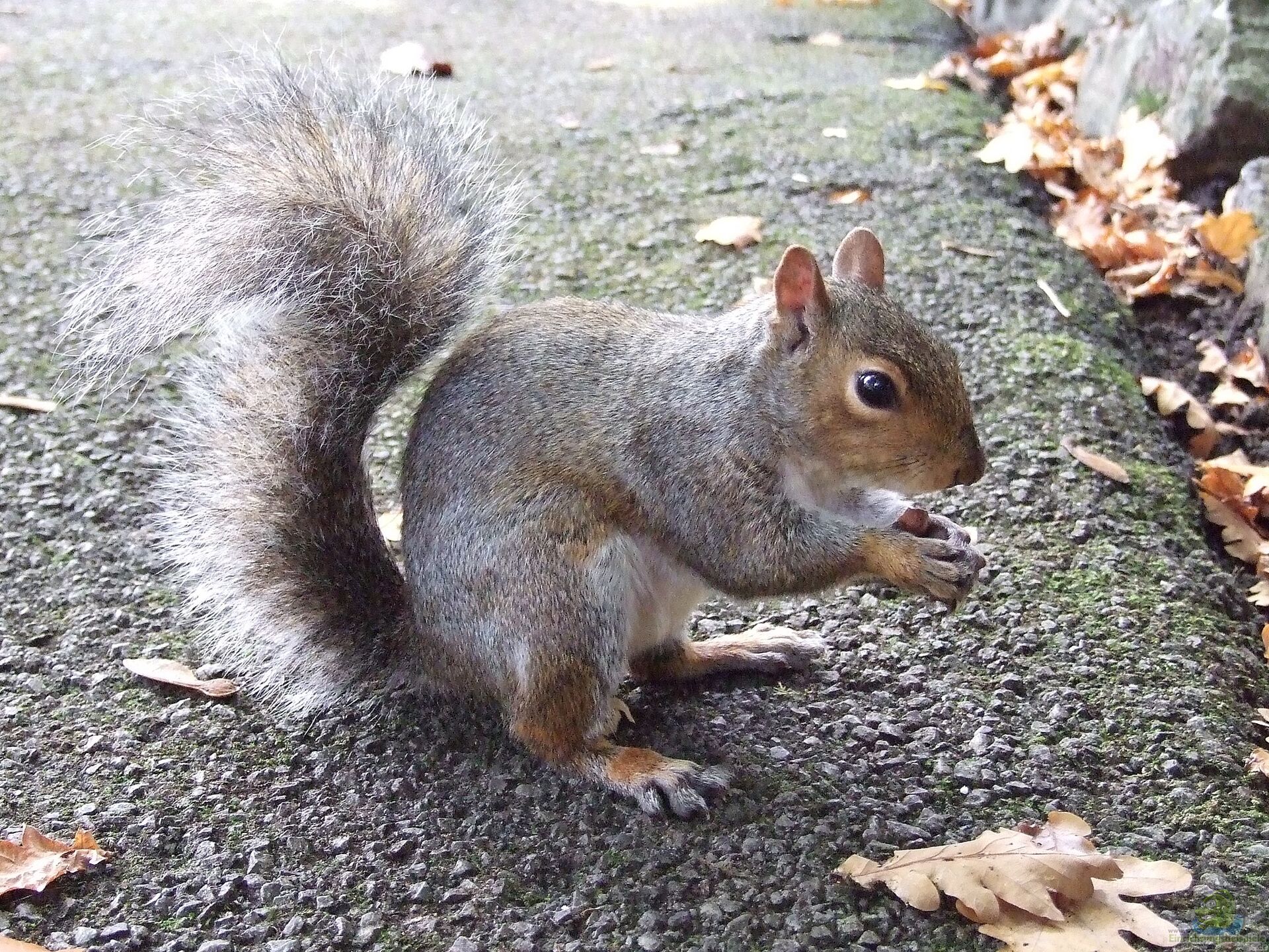 - Aussehen: Graues Fell mit weißlichem Bauch; größer und kräftiger als das Europäische Eichhörnchen.