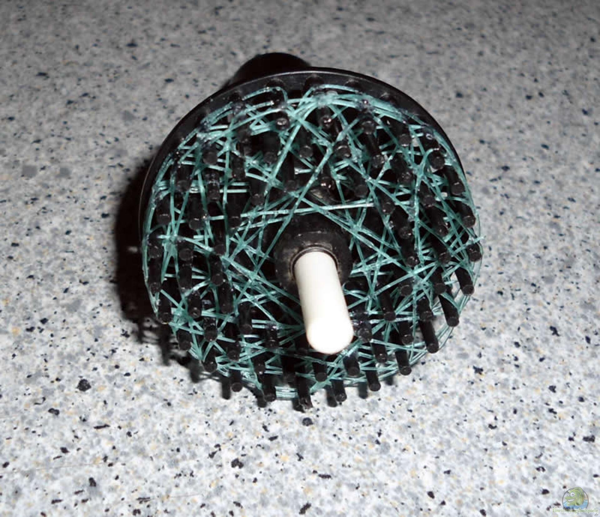 Eine weitere sehr populäre Methode die Leistung des Abschäumers zu verbessern ist, wenn man aus dem Nadelrad ein Fadenrad macht. Mittlerweile sind schon die meisten Hersteller auf den Zug aufgesprungen und versuchen verzweifelt ein Nadelfadenrad zu entwickeln. Um dieses "Tuning" zu machen benötigt man eine Angelschnur oder eine Böschungsmatte aus Kunststoff (je nach dem aus welchem Kunststoff das Nadelread ist, denn nicht überall kann man kleben) und man befestigt diese sorgfältig über die gesamte Höhe der Nadeln. Dabei sollte die Schnur möglichst chaotisch um die Nadeln gewickelt werden. Als Enderfolg beim 9420 verringert sich zwar die Luftleistung leicht von 850 Liter auf ca. 800 Liter, allerdings ist der Schaum viel feiner und steigt zäher im Skimmer. durch die entsprechend grö??ere Oberfläche der Blasen kann man ca. davon ausgehen, dass die Leistung nochmals um 25% oder mehr gesteigert wird. Dieses Tuning ist für alle Nadelräder anwendbar.