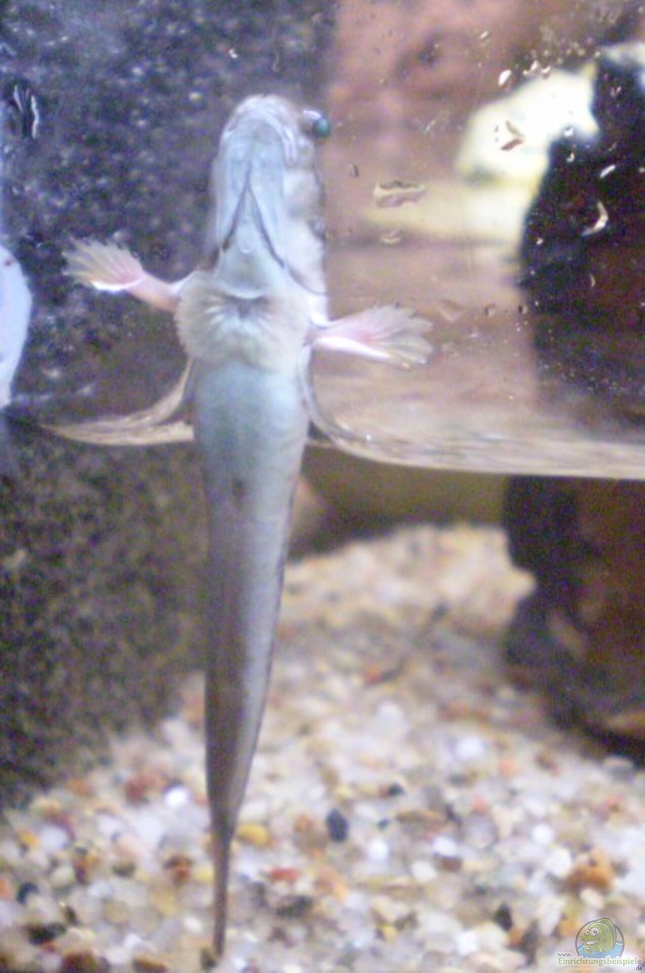Eine Besonderheit haben die Schlammspringer beim Fressen: Wer normale Fische hält, kennt das ja: Da wird das Futter ohne Pause heruntergeschlungen. Schlammspringer können das nicht. Wenn das Maul voll ist, müssen die Tiere eine Pause machen. Dies ist ein gro??er Vorteil, wenn man kleinere Tiere im Becken hat. Diese kann man dann ganz gezielt füttern, während die anderen noch am Schlucken sind.