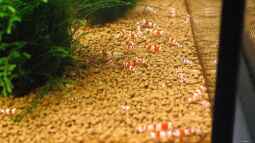 Was Ihr dann danach beobachten könnt, gleicht einem Hühnerhof beim Füttern. Die Garnelen werden in Scharen ankommen und die frisch entmulmte Stelle mit Vergnügen bearbeiten. Ist für die kleinen Racker echt ein Festmahl! Und auch die Mikroorganismen enthalten ja die für Garnelen wertvollen Proteine. Noch ein Grund, der in meinen Augen das Zufüttern von Frost- oder Lebendfutter überflüssig macht. Aber das steht auf einem anderen Blatt.