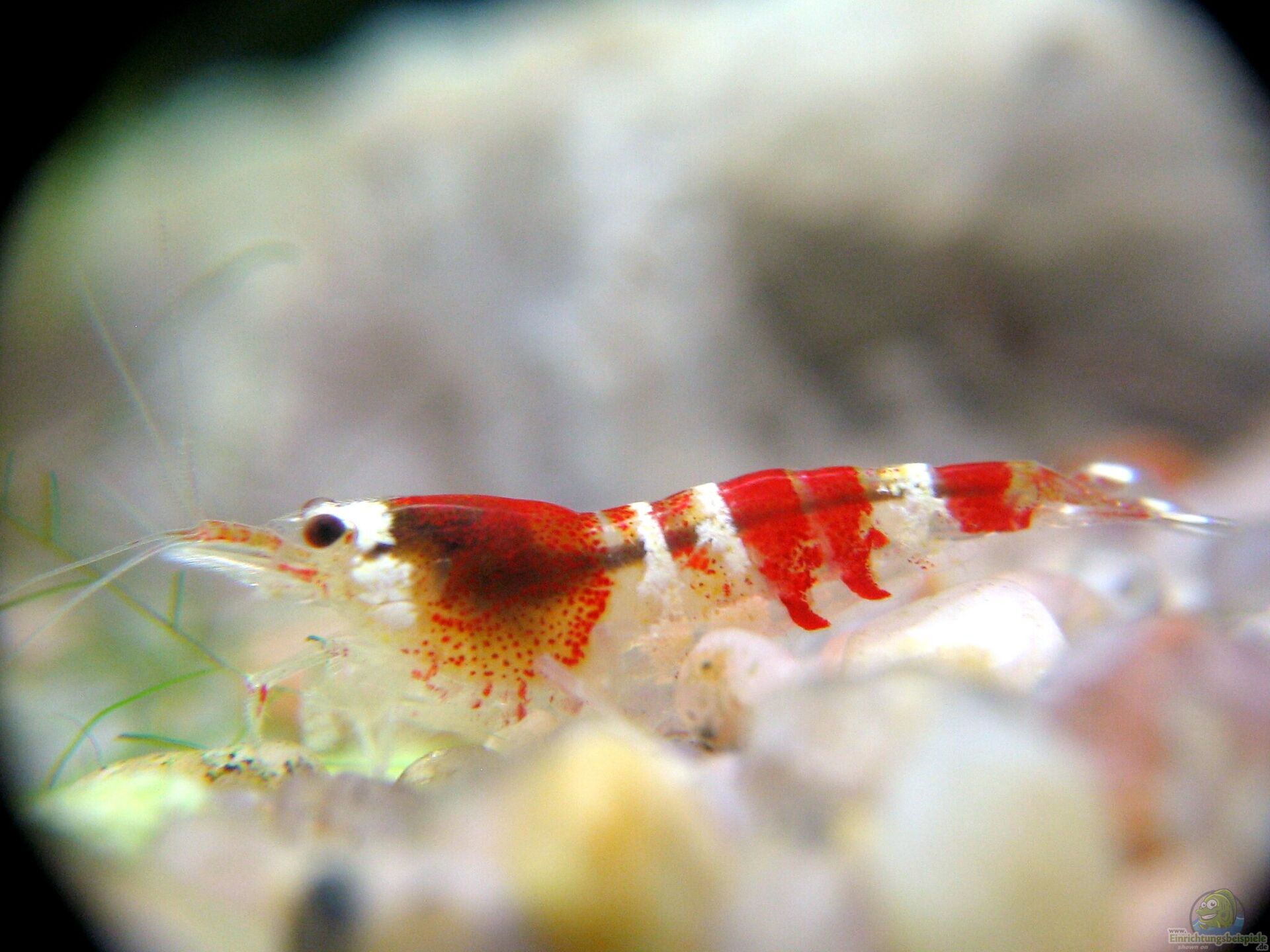- Futter: Algen, Futterreste, spezielles Garnelenfutter, Laub