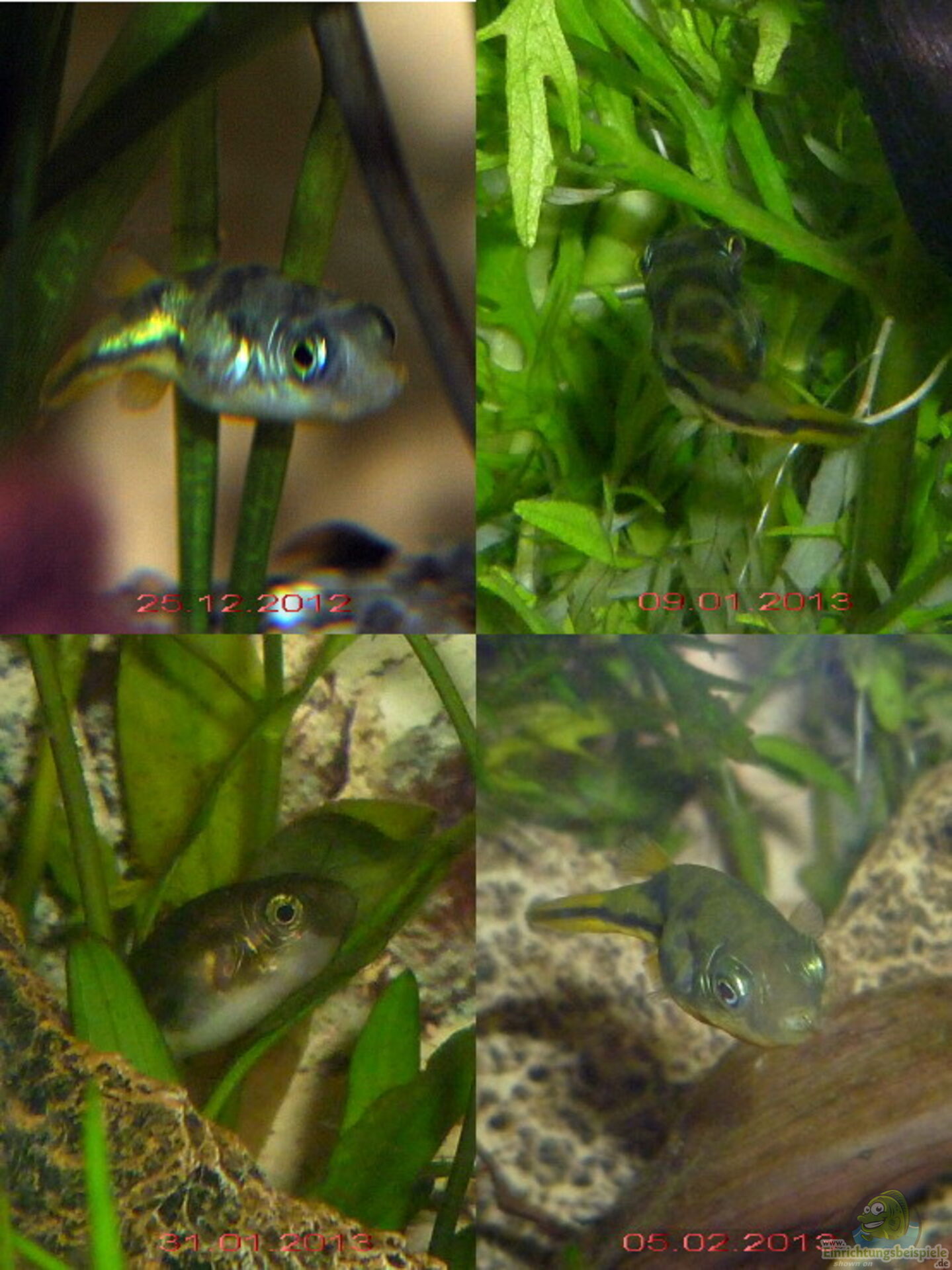 Nachdem mein erster Artikel über die Zwergkugelfische auf viel Interesse stie?? will ich diese Kategorie mit einem neuen Thema fortsetzen und sich mit der Färbung der Haut beschäftigen. Kugelfische besitzen eine widerstandsfähige lederartige Haut, welche nicht mit Schuppen bedeckt ist. Die Schuppen haben sich im Verlauf der Evolution zu kleinen Stacheln und Widerhacken zurückgebildet. Die Färbung der Haut kann sich ähnlich wie beim Chamäleon von Umgebung und Situation verändern, wobei die hier zugrunde legenden biologischen Prozesse identisch sind. Jedoch kommt es auch während der Entwicklung vom Jungfisch zum geschlechtsreifen Tier zu Farbveränderungen. Da ich zwei Zwergkugelfische nun schon über 2 Monate pflege und die Tiere sich nun im geschlechtsreifen Alter befinden, habe ich ein paar Bilder zusammengefasst, welche mögliche Veränderungen der Hautpigmentierung belegen sollen.