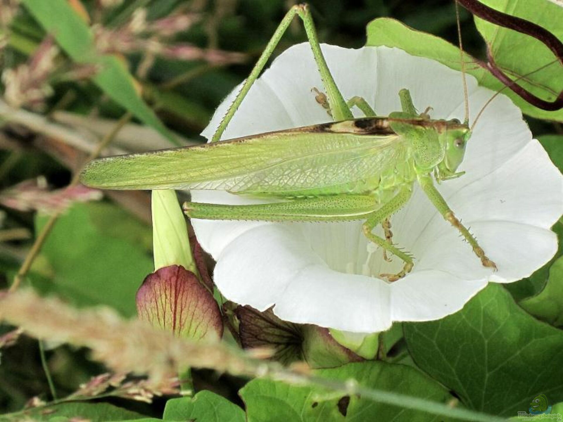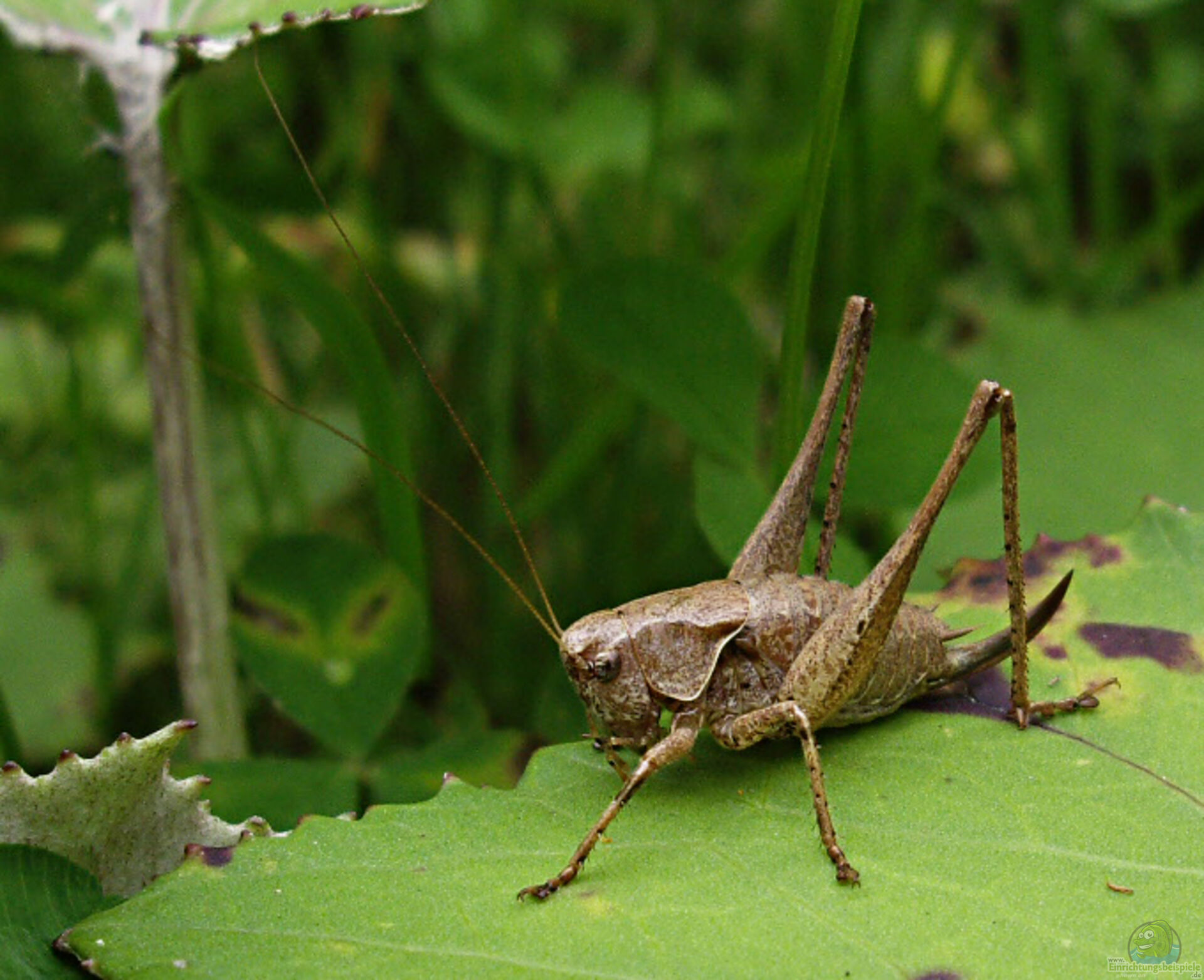 Beschreibung: Grüne Laubheuschrecke, lange Antennen, typischerweise in feuchten, dichten Vegetationen