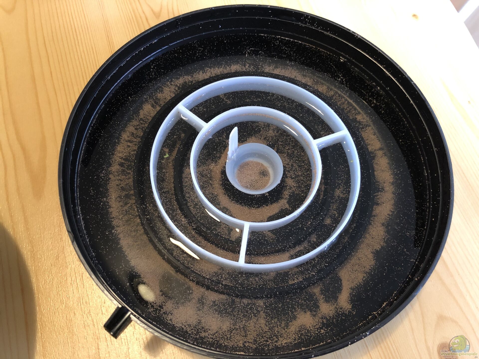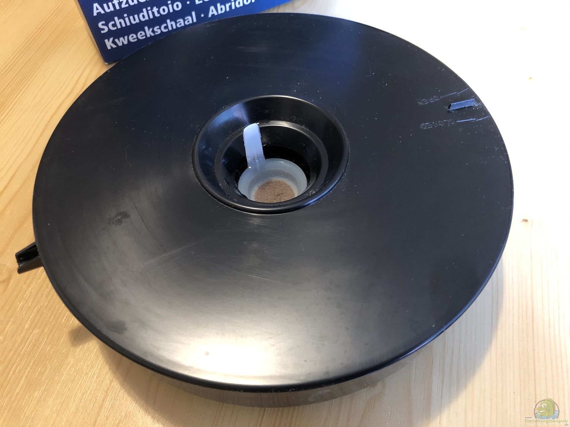 Die Entnahme der Nauplien geschieht in der Mitte. Dort ist ein Sieb angebracht und die Artemia Nauplien schwimmen automatisch alle ins Licht. Man sollte die Schale auch etwas wärmer stellen. Vielleicht ans Fenster oder auf die Abdeckung, aber vor der Entnahme sollte man das Gefä?? nicht bewegen, da sonst die Nauplien wieder aus dem Sieb schwimmen könnten. Man müsste also wieder etwas abwarten, bis sich die kleinen Pünktchen wieder im Sieb angesammelt haben.