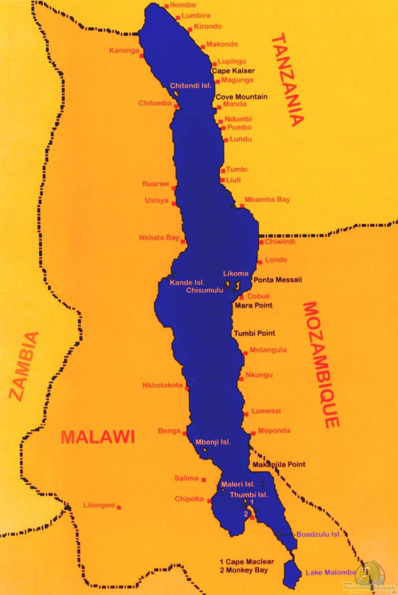Der Malawisee, der drittgrö??te See Afrikas, ist ca. 24.000 km² gro??, an seiner längsten Ausdehnung 575 km lang, bis zu 85 km breit und hat 14 Zuflüsse. Mit einer Tiefe von bis zu 700m ist er auch der vierttiefste See der Welt, im Norden tiefer als im Süden, dadurch auch im Süden fischreicher.