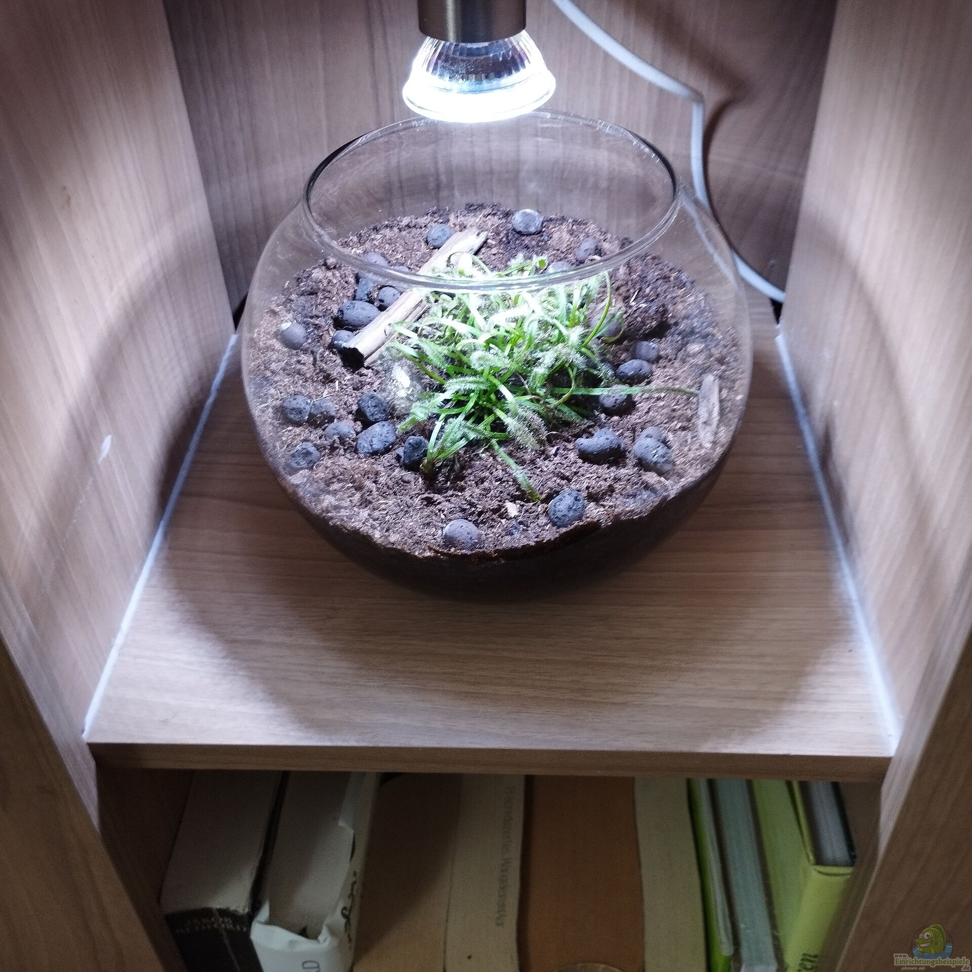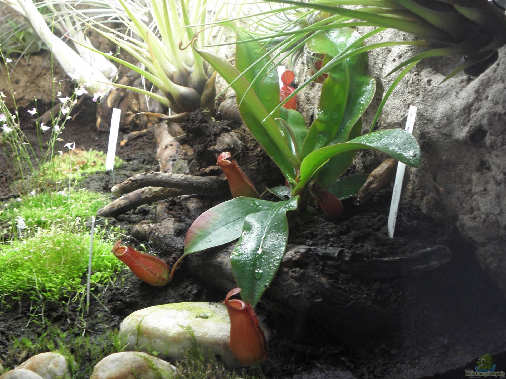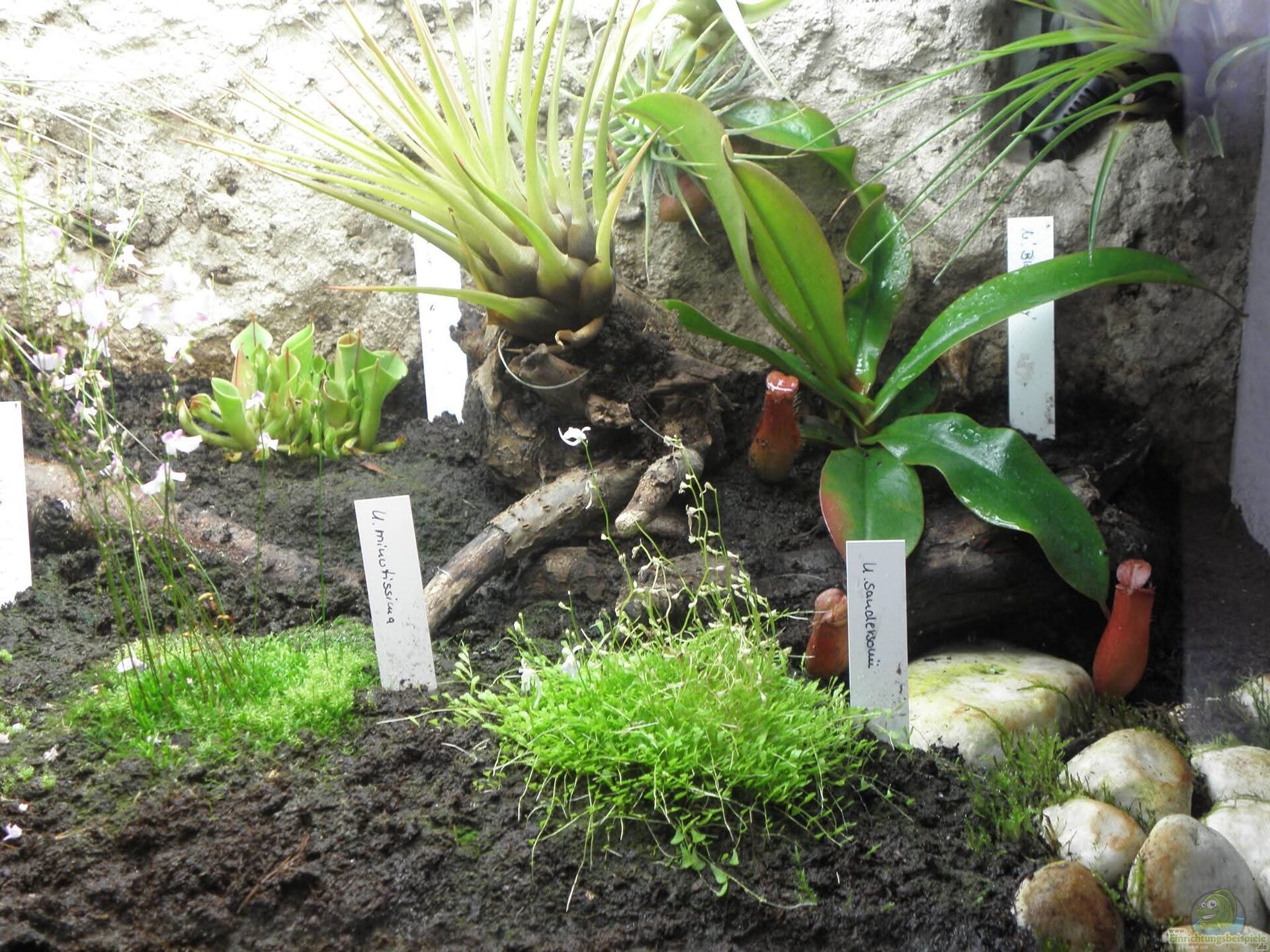 Eine Karnivoren-Terrarium ist eine Zusammenstellung von fleischfressenden Pflanzen, die in einem Terrarium oder in einer Kugelvase, bzw. In einem geschlossenen Behältnis gepflegt werden. Diese Pflanzen benötigen eine hohe Luftfeuchtigkeit, einen hellen Standort und vor allem kalkfreies Wasser. Fleischfressende Pflanzen bevorzugen vor allem helle Standorte, jedoch sollte direkte Sonneneinstrahlung wie z.B. die pralle Mittagssonne vermieden werden, um Verbrennungen zu verhindern. Ein Fensterplatz, der viel Licht bietet, ist ideal, aber im Hochsommer kann eine Beschattung notwendig sein. Eine Künstliche Beleuchtung muss allerdings eingesetzt werden, wenn ein heller Standort fehlt Ausreichendes Licht ist für ein Karnivoren-Terrarium oder eine Karnivoren Kugelvase absolutes Muss. Auch eine recht hohe Luftfeuchtigkeit ist für die meisten Karnivoren sehr wichtig. Diese sollte idealerweise zwischen 50 und 80% liegen. Ein Terrarium, ein Aquarium oder eine Abdeckung ist bei solchen Anlagen von großem Vorteil, da dadurch die erhöhte Luftfeuchtigkeit gewährleistet wird. Ebenso hilfreich ist das regelmäßiges Besprühen mit kalkfreiem Wasser. Fleischfressende Pflanzen sollten in spezieller Karnivorenerde oder einem Torf-Sand Gemisch eventuell mit Zugabe von Perlit und Vermiculit gepflanzt werden. Das Substrat muss stets feucht gehalten werden, es gilt auch hier Staunässe zu vermeiden. Kalkhaltiges Wasser ist für Karnivoren schädlich, daher sollte man immer Regenwasser oder destilliertes Wasser zum Gießen seiner Pflanzen verwenden. Verwendet man ein Terrarium oder Aquarium für seine Karnivoren, so kann man auch der Optik halber die Rückwand gestalten. Als Dekoration eignen sich Wurzeln und Steine (kein Kalkstein). Dadurch entsteht in solchen Anlagen ein bizarres Landschaftsbild was jeden Betrachter aufs Neue fasziniert.