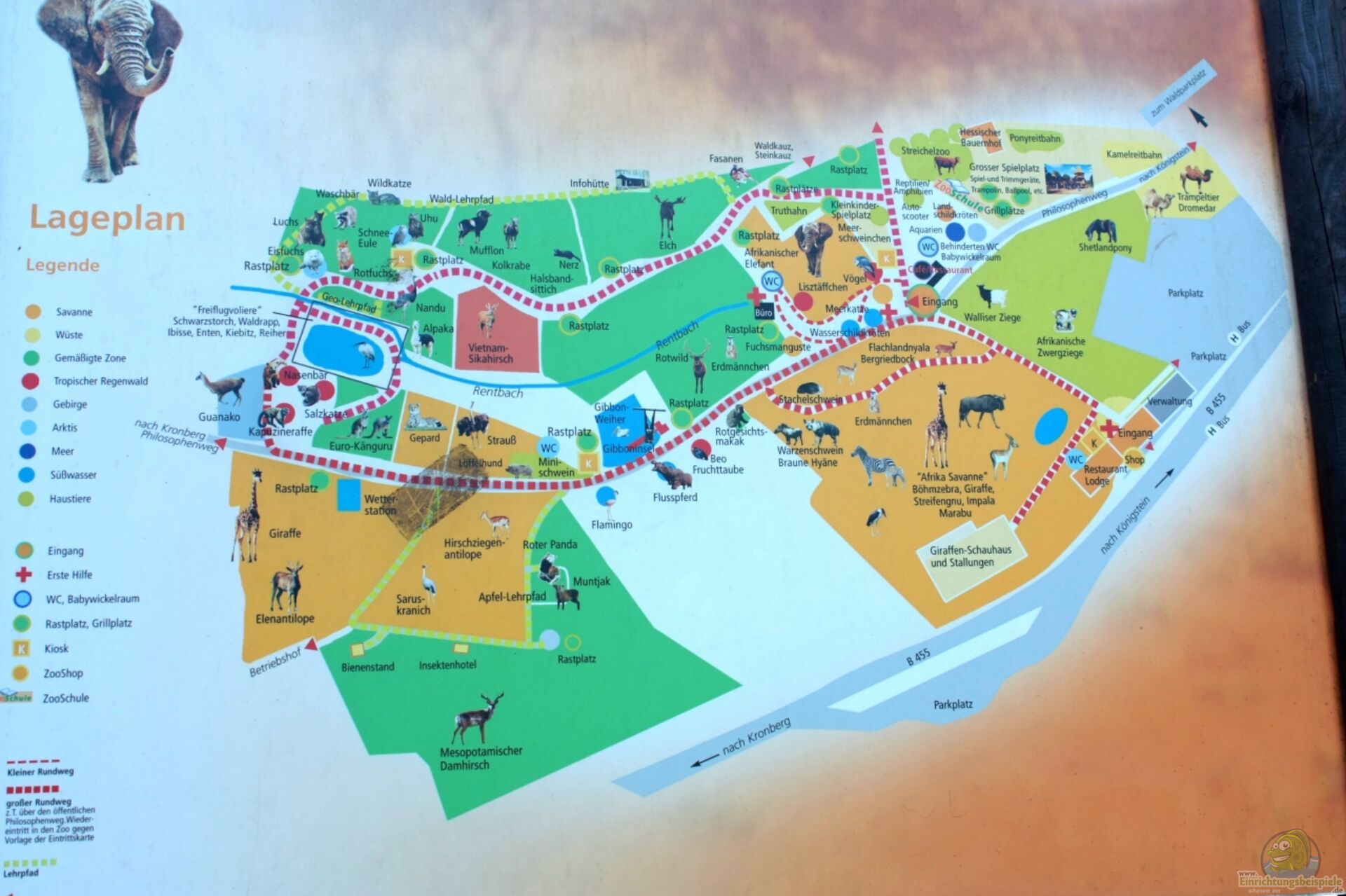 Direkt am Anfang kommt man in ein grosses Streichelgehege mit vielen Haustierrassen und man muss gut aufpassen das der Futtervorrat nicht hier schon vernichtet wird. Zentral im Park wird eine grosse Freilaufanlage für die Elefant errichtet, die zum Zeitpunkt unseres Besuchs noch nicht fertig gestellt war, man konnte aber die Dimensionen bereits erahnen. Die weiteren Wege gehen zum Teil über Waldpfade, zum Teil über gepflasterte Wege durch das bergige Gelände. Für den ganzen Park gilt man sollte gut zu Fuss sein und die kleinen "Umwege" die durch den Wald führen lohnen sich, wenn man sich nicht scheut ein bisschen Energie aufzubringen. Es werden viele Tiere gezeigt die auch in Europa Zuhause sind, was durchaus seinen eigenen Reiz hat, da diese so in einem Lebensraum gehalten werden können welcher ihrem natürlichen sehr nahe kommt.Hier kommt nun auch das Futter, zu unserer Begeisterung oftmals zum Einsatz. Viele Tiere lassen sich aus der Hand füttern und das weit über das hinaus was man aus den meisten anderen Zoos so kennt.So sind neben Ziegen, Schafen, Eseln, Schweinen auch Rotwild, Nasenbären, Emus, Primaten, Lamas, Stachelschweinen, afrikansichen Steppenbewohnern, Elefanten und sogar Flusspferde dankbare Abnehmer und zeigen keinerlei Scheu. Dieses verleiht dem Besucher eine ganz andere Nähe zu den Tieren. Weiterhin wird auch auf örtliche Gegebenheiten wie Gesteine eingegangen in Form mehrerer Lehrpfade.Es gibt ausserdem eine sehr grosszügige Steppenanlage in der mehrere afrikanische Savannenbewohner untergebracht sind, aber am Besten macht ihr euch ein eigenes Bild.