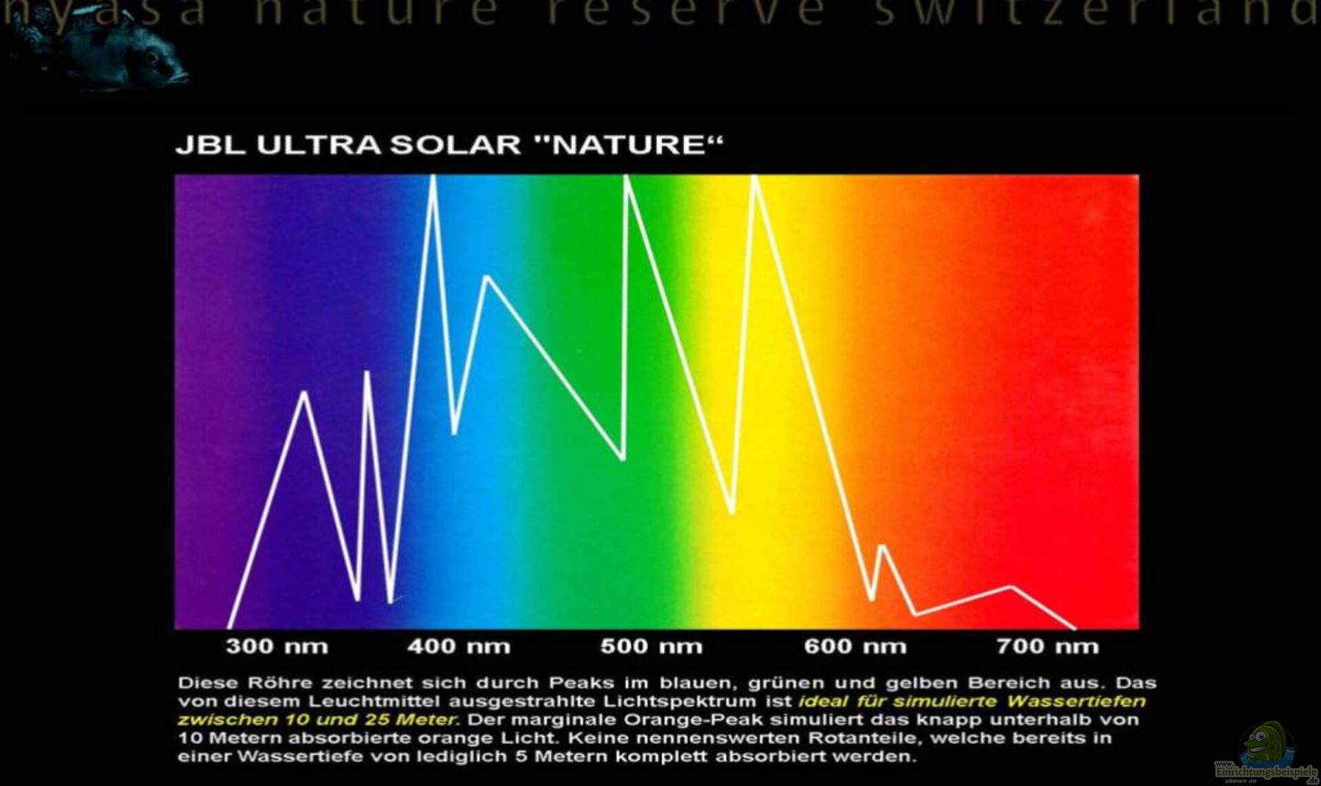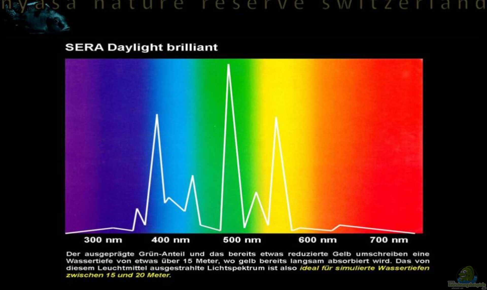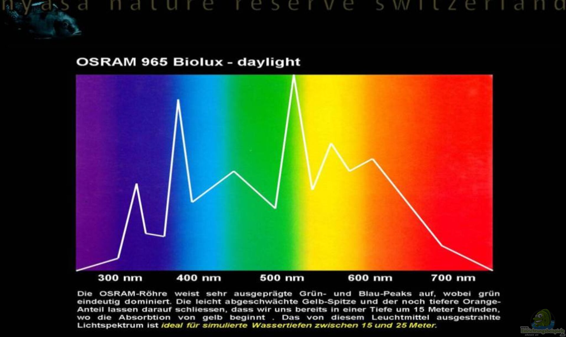 Aussagen, dass die Sonne über dem Malawisee besonders stark sei und auch in tiefere Wasserregionen vordringen würde, sind nur bedingt richtig. Korrekt ist, dass die Sonnenstrahlen in Aequator-Nähe in einem steileren Winkel auf die Erde resp. das Wasser auftreffen und das Licht somit beim Auftritt weniger stark gebrochen wird als bei uns in Zentral-Europa ??? trotzdem werden aber die verschiedenen Lichtwellen unter Wasser Schritt für Schritt absorbiert. Die in der Grafik definierten Eindringtiefen basieren auf den Werten im Malawisee und weichen dadurch ein wenig von europäischen Angaben ab.