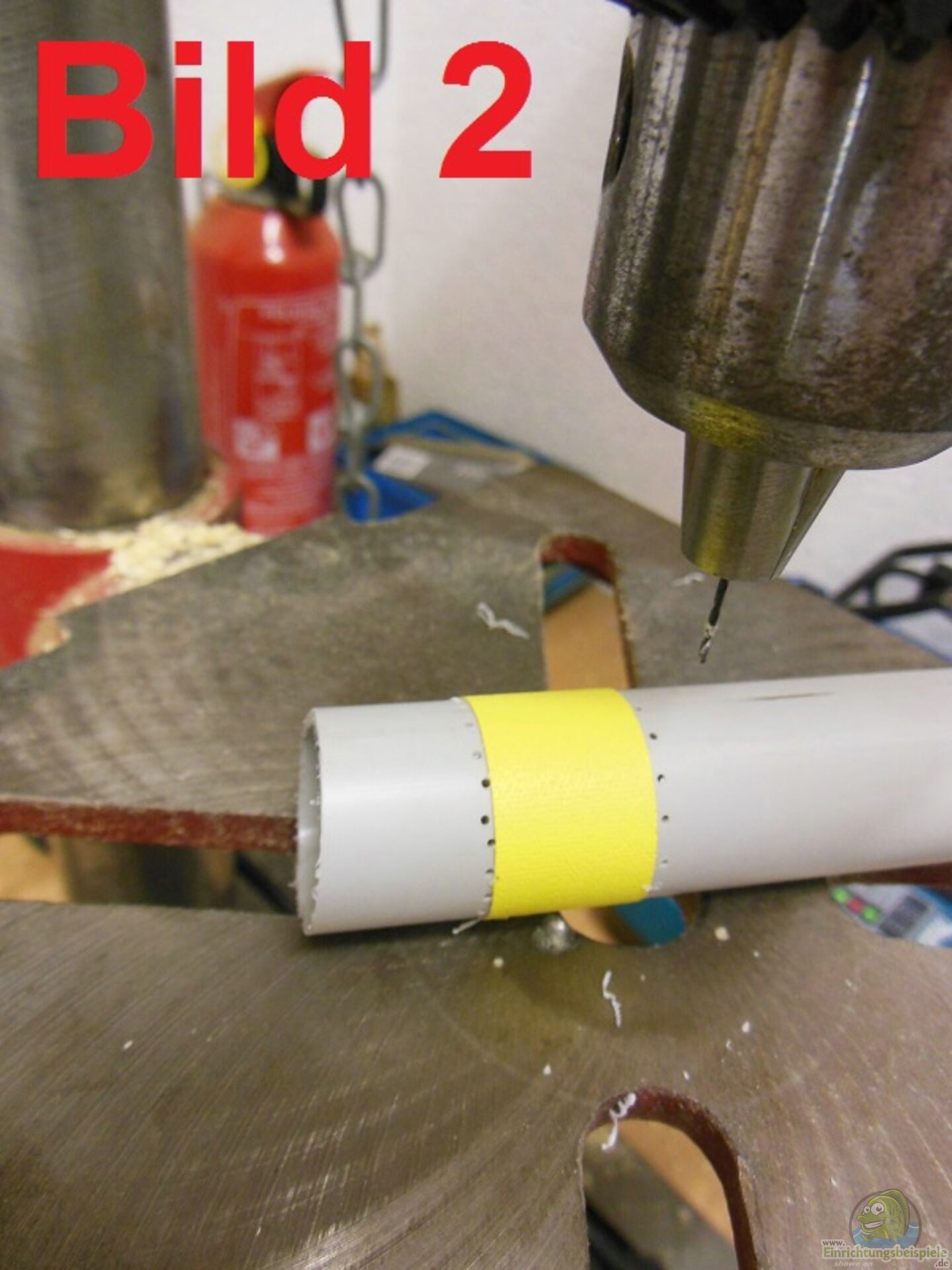 Mit dem Schmiergelpapier werden die Schnittkanten entgratet, dann klebe ich an einer Steigrohrseite 2cm vor dem Ende ein Klebeband um das Rohr (siehe Bild 2). Das Klebeband dient mir nur als Bohrmarkierung, denn in das Rohr sollen zwei Reihen Bohrlöcher. So kann ich rechts und links vom Klebeband bohren und habe halbwegs gerade Bohrkränze. Mit dem 1mm Bohrer geht"s dann auch schon frisch ans Werk und es wird gebohrt, ich setze pro Reihe ca. 20-25 Bohrungen (ich darf nochmal auf Bild 2 verweisen...).