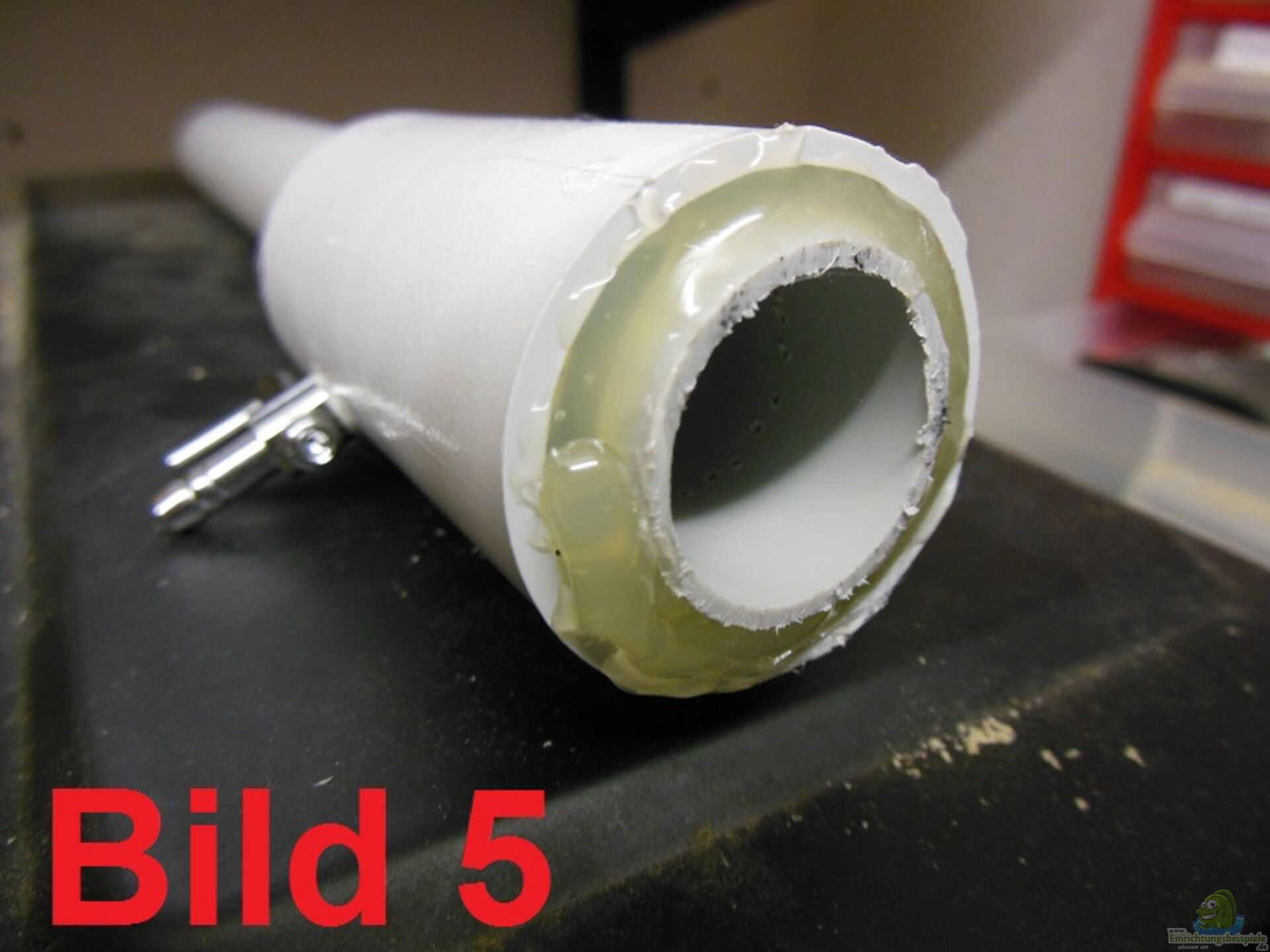 Nun geht"s ans kleben... Die Druckdose kommt über das gebohrte Ende des Ansaugrohres und zwar so, da?? sich der Lufthahn oben befindet. Dadurch kann sich später in der Druckdose ein Luftpolster aufbauen das nach unten drückt und über die beiden Bohrkränze in das Ansaugrohr eindringen und aufsteigen kann.