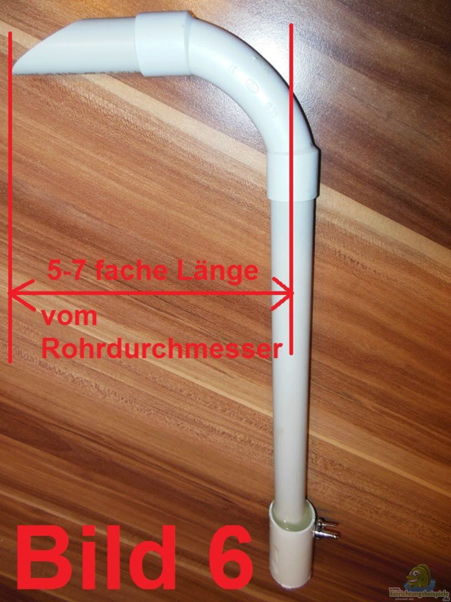 Die Länge des Auslaufsrohres sollte, von der Mitte des Ansaugrohres aus gemessen, das 5-7fache des Rohrdurchmessers betragen - ein schicker Satz den man erstmal verdauen mu??. Also unser Rohrdurchmesser beträgt 25mm, die Länge des Rohres sollte das 5-7fache von diesen 25mm sein. Einigen wir uns mal auf die Mitte, also auf das 6fache: 6x25mm ergibt eine Länge von 150mm. Wenn wir nun das Auslaufrohr 150mm lang machen, wäre es aber zu lang - wir haben ja noch den Rohrbogen dabei. Ich denke Bild 6 macht vieles deutlicher...