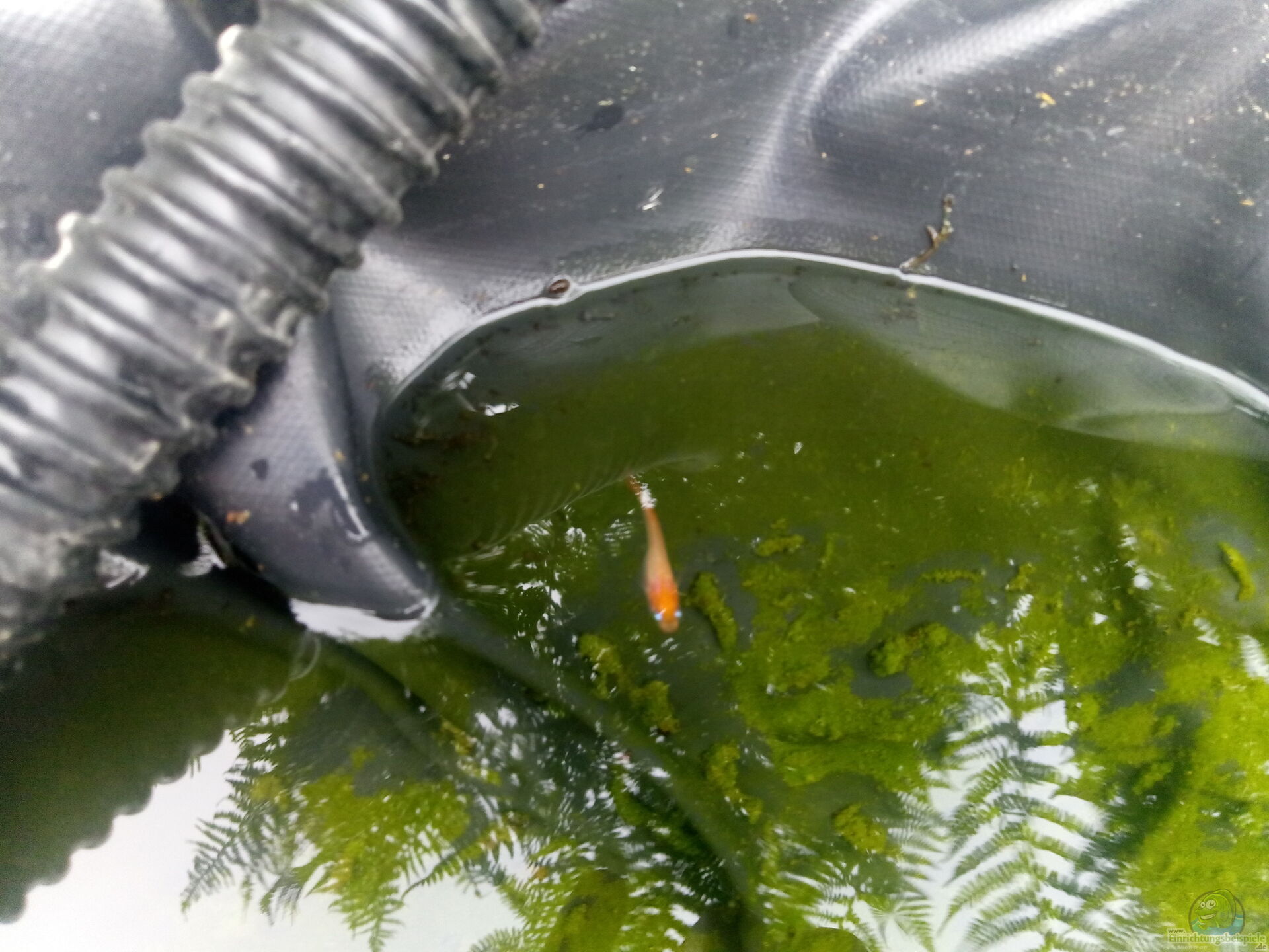 Behälter nach draußen stellen und schrittweise über mehrere Stunden Teichwasser hinzufügen.