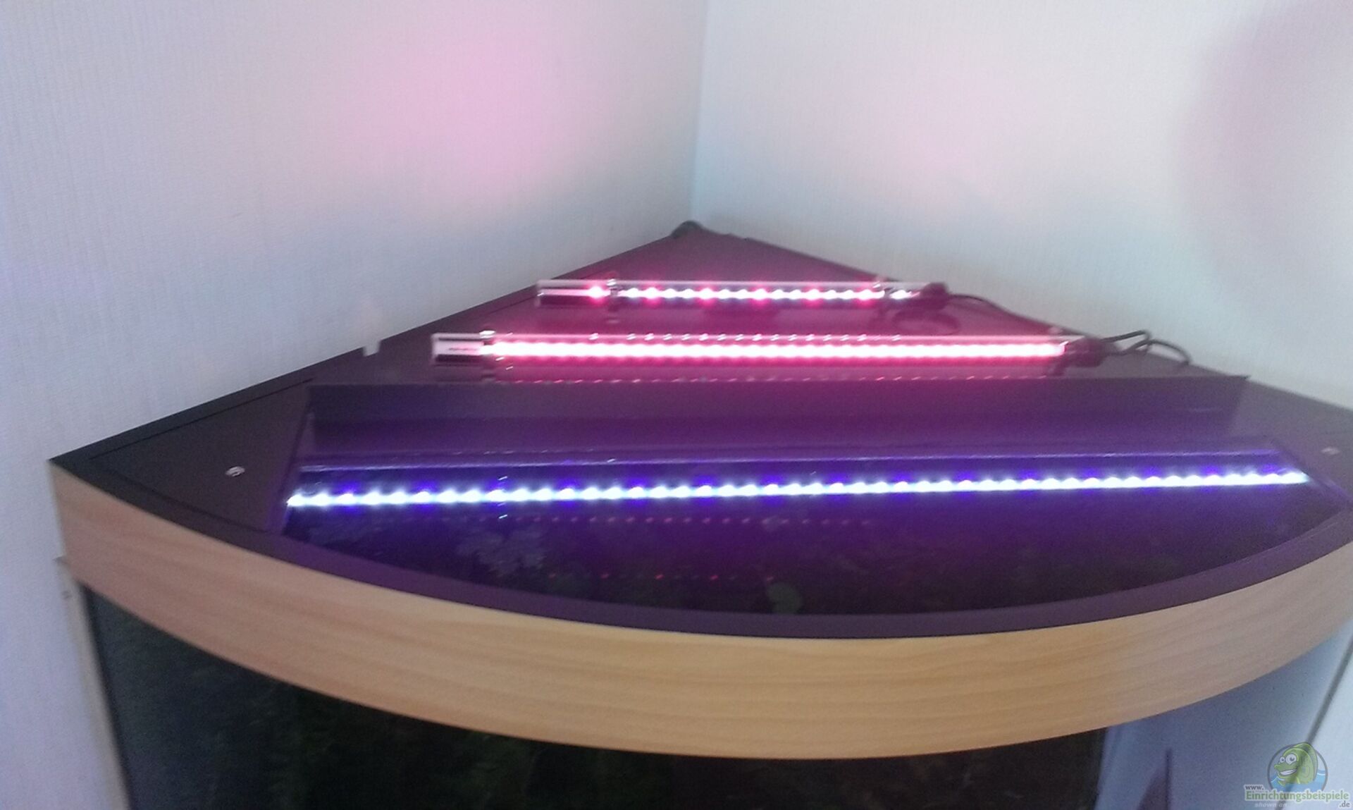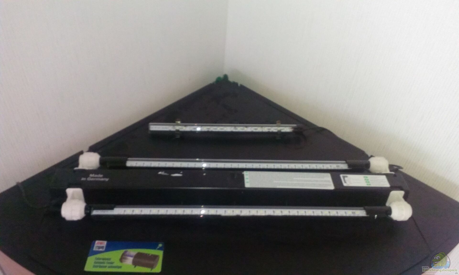 Der alte T5 Lampenkasten wurde durch ein selbstgebasteltes "Konstrukt" (bitte fragt mich nicht nach einer Bastelanleitung) aus mehreren miteinander verklebten Plasteplatten ersetzt. Vorn hängt jetzt (wie schon gesagt) eine Cool daylight der Länge 820mm über die gesamte Diagonale des Eckaquariums, in der Mitte die Sunrise Plantcolour 520mm und in der hinteren Ecke eine Daylight sunrise 360mm.