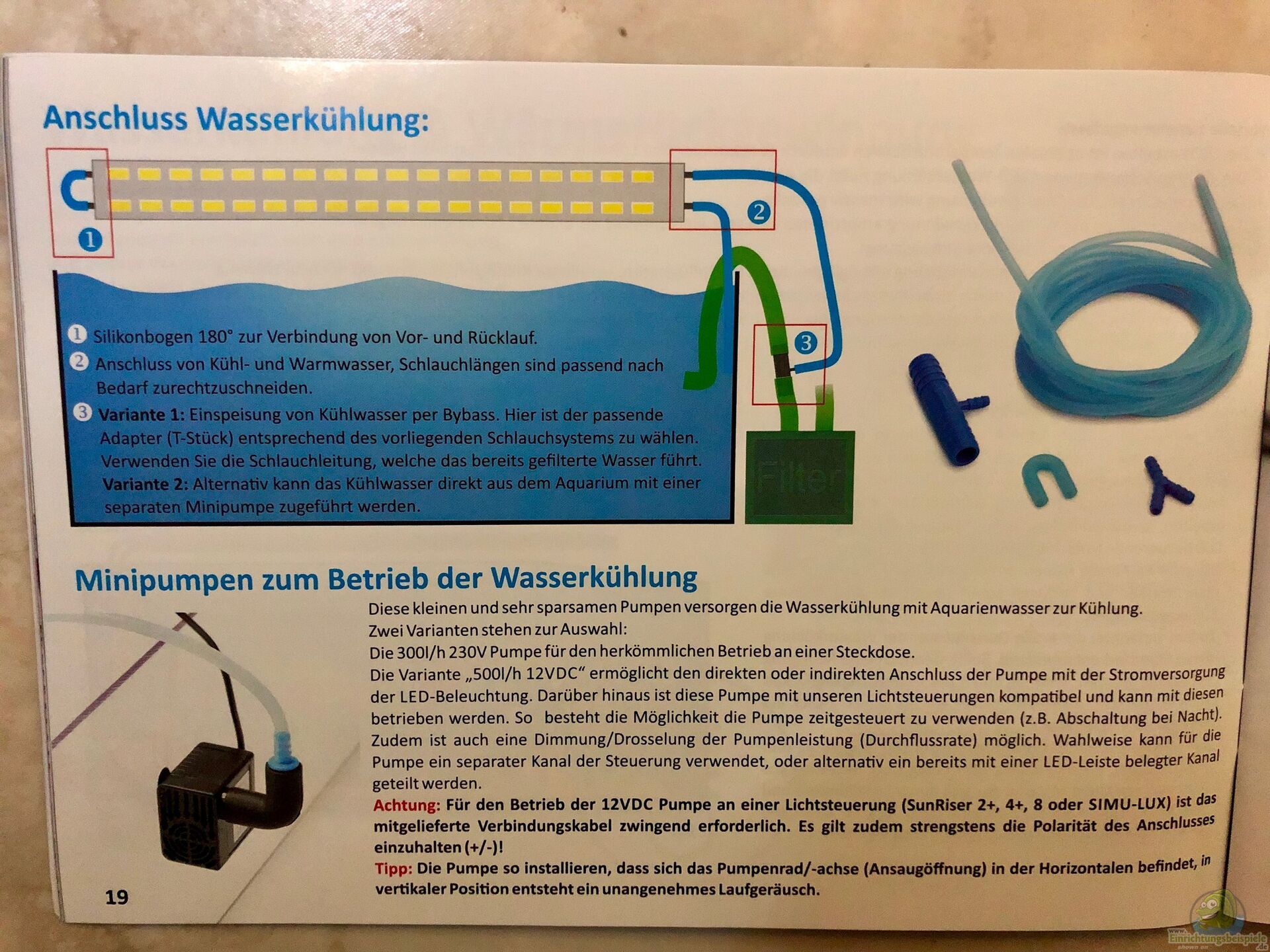 Es gibt sogar zwei Varianten, mit der man die Leiste kühlen kann. Zum einen kann man einen Teil des Wassers aus dem Einlaufschlauch (aus dem Filter kommend) mit einem T-Modul über die LEDaquaristik-Leiste ins Aquarium laufen lassen. Zum anderen verwendet man die mitgelieferte Pumpe und pumpt das Wasser direkt in die Kanäle der Leiste.