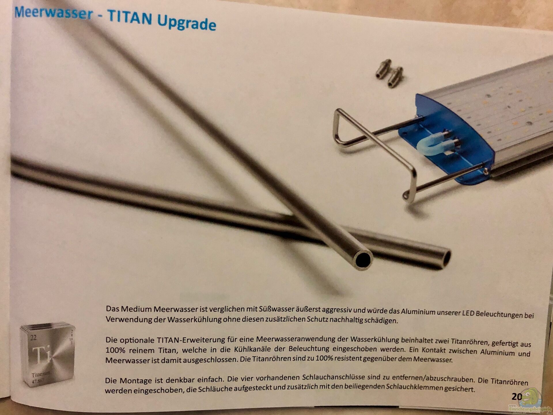 Und noch was ??? für die Salzwasser-Aquaristik gibt es Titan-Zusätze für die Leiste, um auch die LEDaquaristik Beleuchtung mit Salzwasser kühlen zu können. Im Heft wird jedoch von einer Kühlung ohne diese Titan-Zusätze abgeraten, da das doch ???aggressivere??? Salzwasser die Leuchte zerstören könnte/würde.