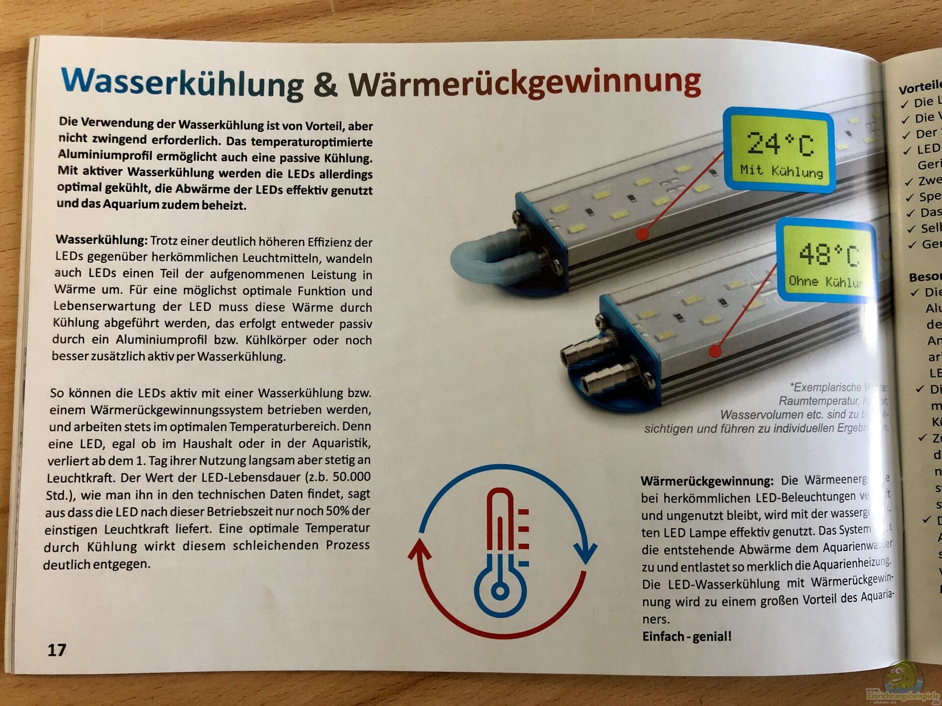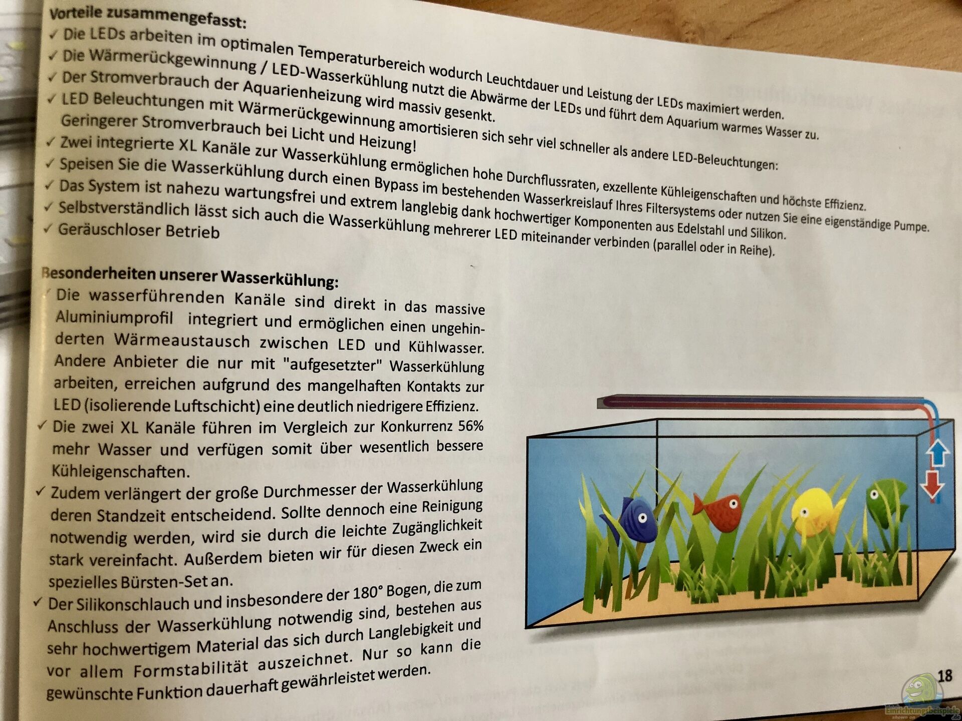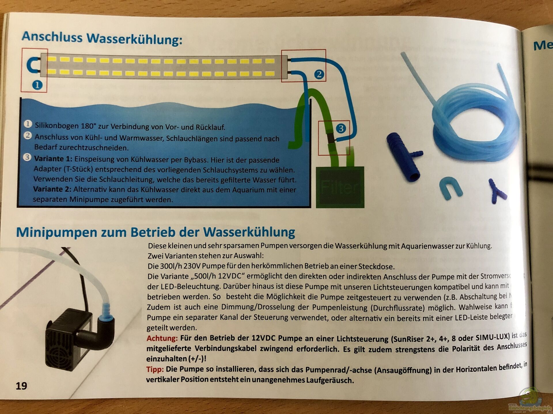 Was mir noch sehr gefällt, das ist die Wasserkühlung, die man verwenden kann. Ich rate auf alle Fälle das System zu verwenden und auch in der Betriebsanleitung steht, dass man dies tun sollte um die Lebensdauer der LED-Aquaristik-Lampe zu erhöhen.